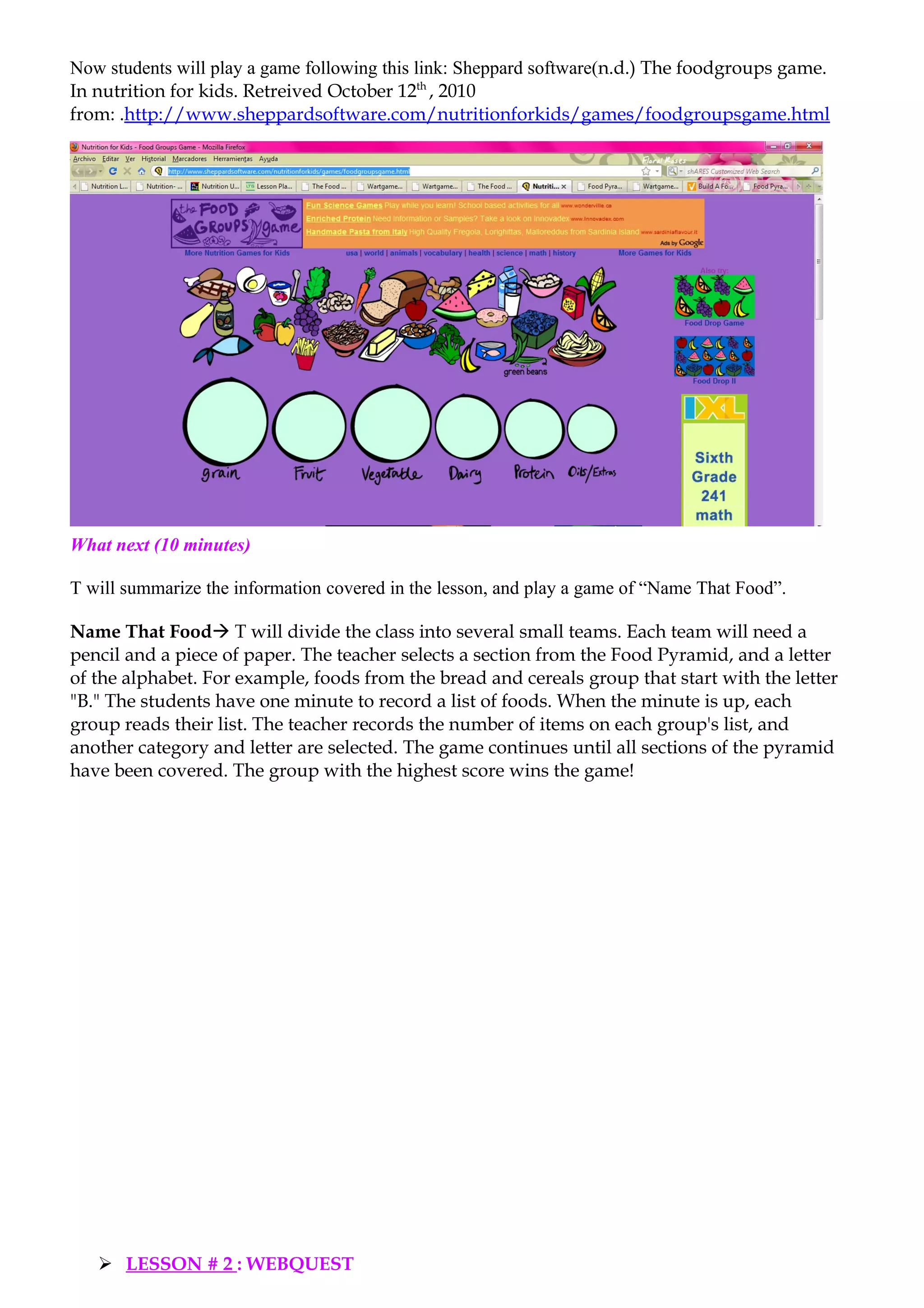 The document provides details on three lessons that are part of a unit on how to be healthy for 6th form students. Lesson 1 introduces food groups and has students play a game to learn them. Lesson 2 is a webquest where students research food components, health topics and diseases in groups. They answer questions and write a composition. Lesson 3 reviews the food pyramid and has students complete a healthy lifestyle questionnaire. The lessons use discussions, videos, games and a webquest to teach students about nutrition, food groups, calories, fats, carbohydrates, health conditions and developing healthy habits.