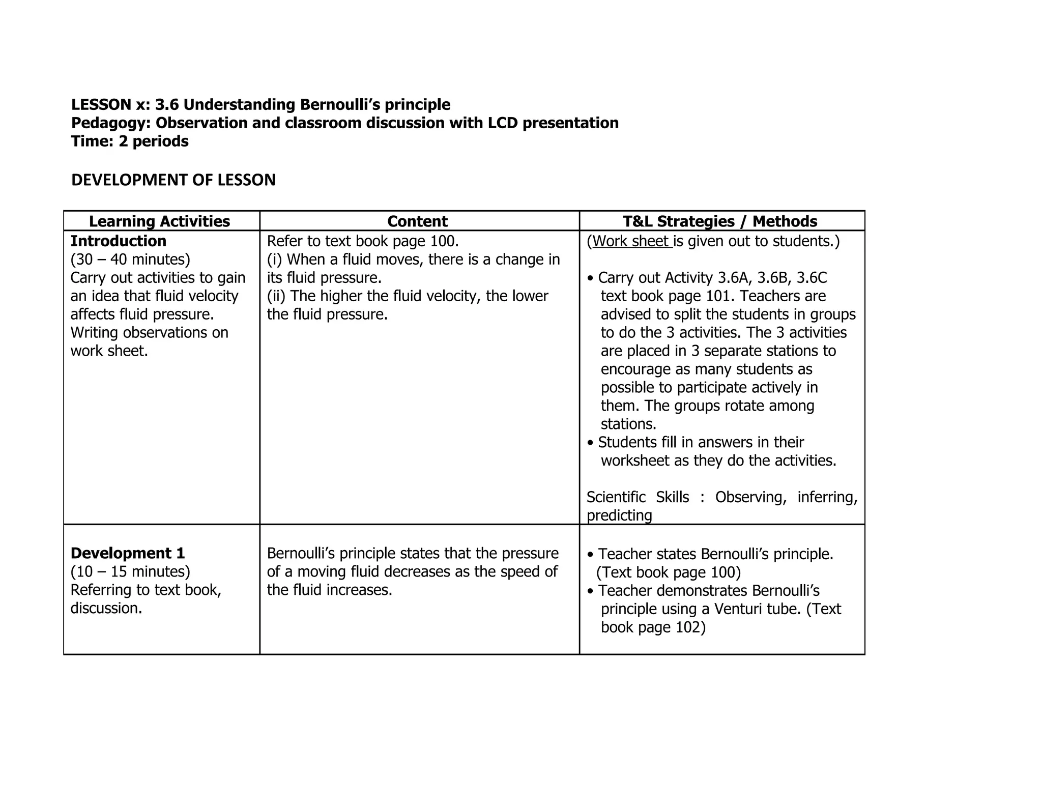 The document outlines a 2 period lesson plan on Bernoulli's principle. It includes 3 stages: 1) hands-on activities to demonstrate how fluid velocity affects pressure, 2) a practical experiment and discussion of Bernoulli's principle, and 3) examining applications like airplane wings and answering worksheet questions. The goal is for students to understand that fluid pressure decreases as speed increases according to Bernoulli's principle through observation, discussion, experimentation and making connections to real-world examples.