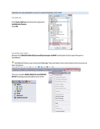 This document provides an overview of how to use SolidWorks Plastics to simulate the injection molding process. It outlines the steps to: