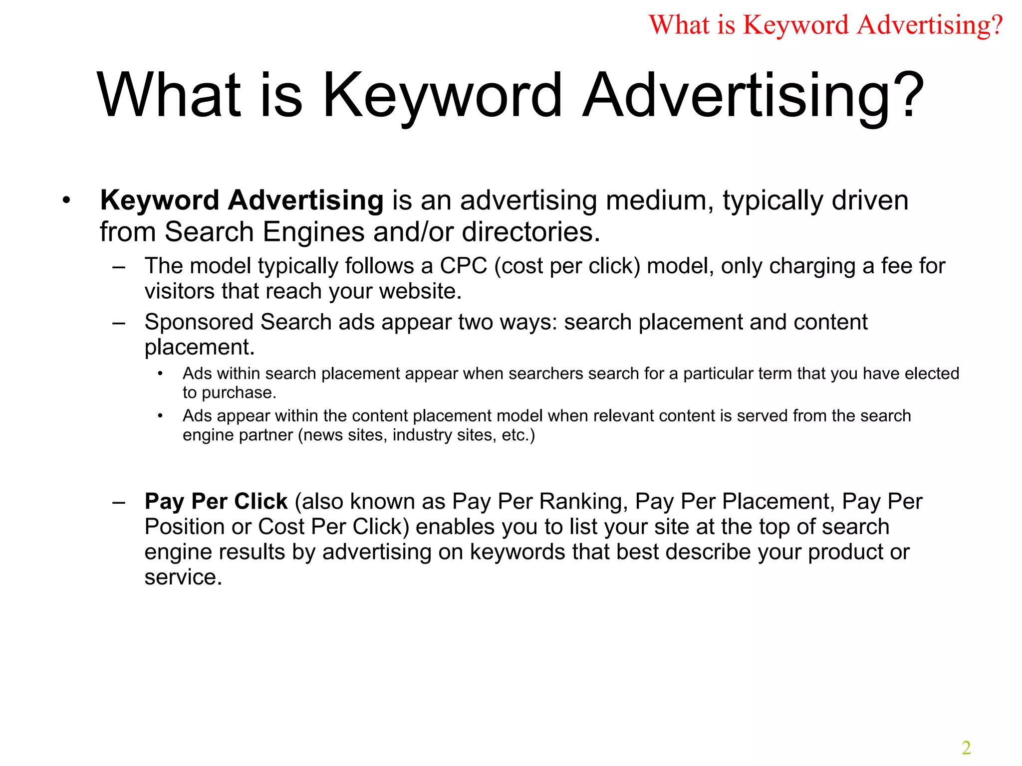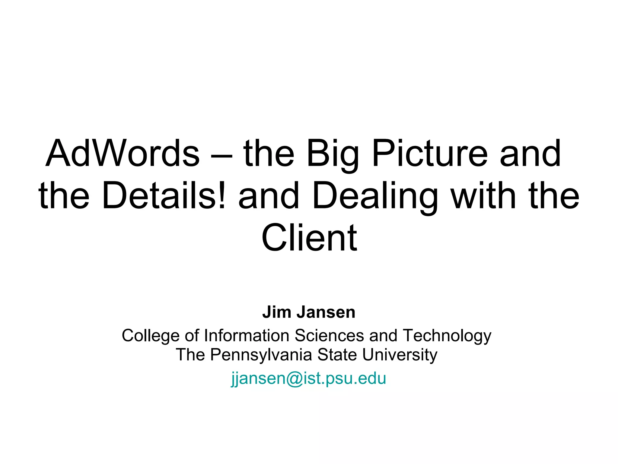 The document provides an overview of Google AdWords and tips for getting started with paid search advertising campaigns. It discusses what keyword advertising is, how AdWords works, campaign setup and management on Google AdWords. It also offers advice for selecting a client and initial steps to take to set up an advertising campaign for the client, including understanding their business, goals and expectations.