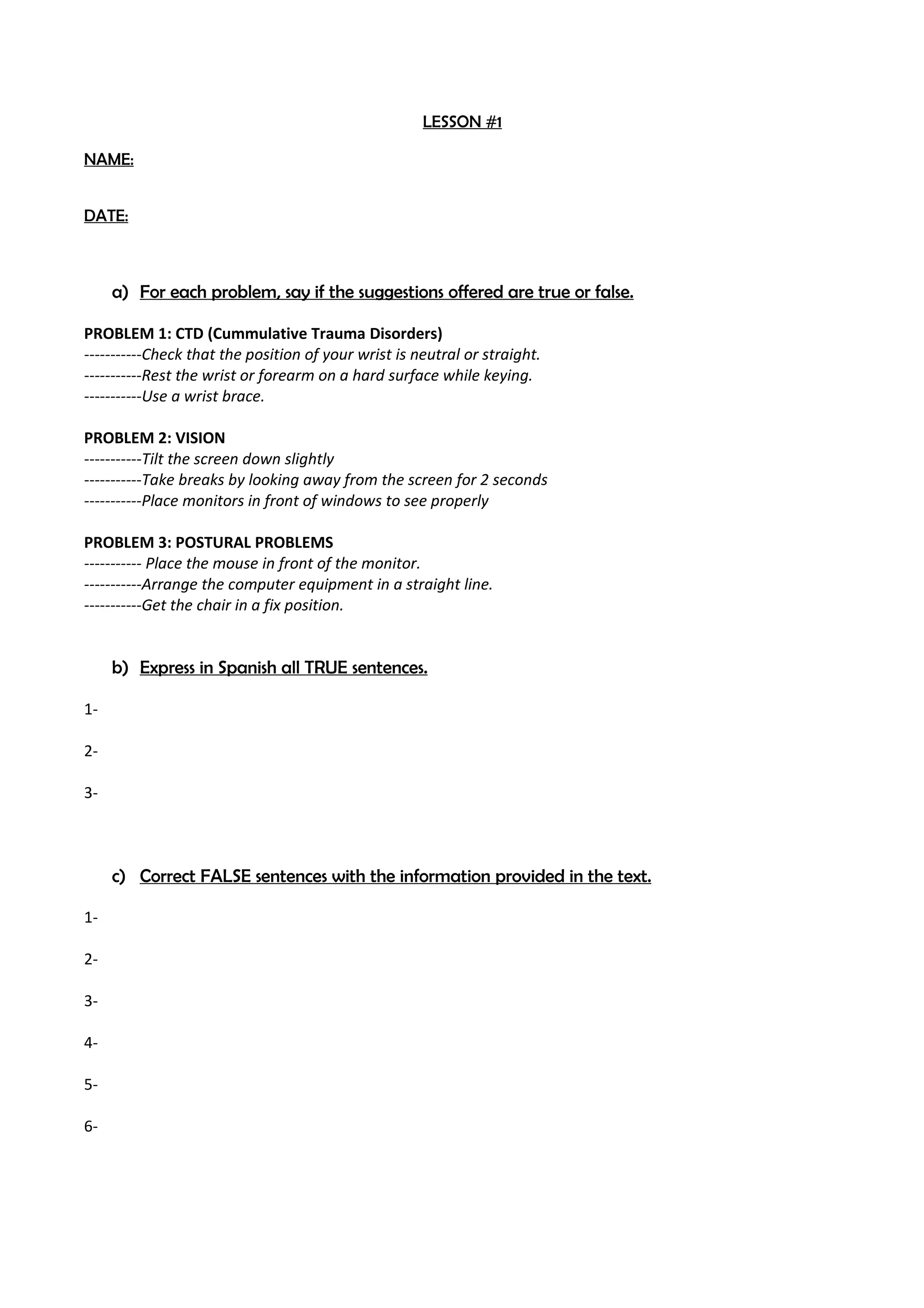This document provides information on ergonomic issues and suggestions to address problems related to CTD, vision, and posture when working at a computer. It asks the student to identify which suggestions are true or false, translate the true suggestions to Spanish, and correct any false suggestions. The student is then meant to fill in their responses.