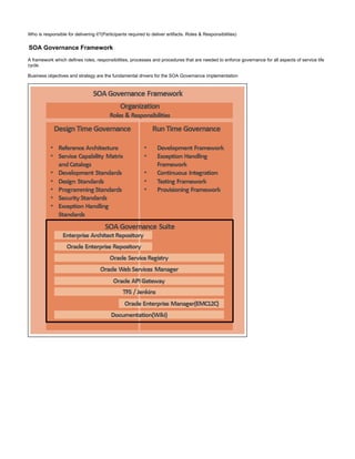 1. The document discusses SOA (Service Oriented Architecture) governance. SOA governance provides an accountability framework to help organizations realize business benefits from reusable assets and eliminating liabilities.