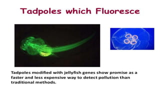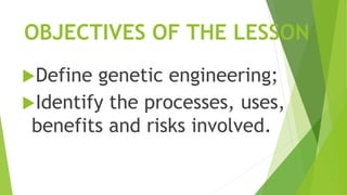 This document provides information about genetic engineering. It defines genetic engineering as transferring DNA between organisms and artificially manipulating genes. The document outlines several genetic engineering techniques including recombinant DNA, cloning, DNA amplification, and genetic diagnosis. It also discusses uses of genetic engineering like producing insulin and making crops resistant to diseases. The benefits are listed as higher crop yields and more nutritious foods, but risks include unknown human/environmental effects and corporate control of food production.
