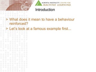 The document provides an introduction to Ivan Pavlov's famous experiment with dogs. It explains that Pavlov noticed dogs salivating when they heard a sound associated with being fed, even if food was not present. Pavlov conducted experiments ringing a bell when feeding the dogs, and the dogs soon learned to associate the bell with food and would salivate upon hearing it. The document also discusses how reinforcement learning works, where behaviors are increased through rewarding responses.