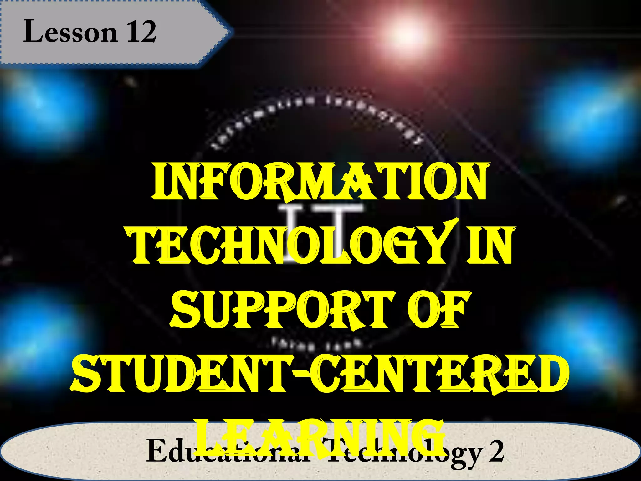 The document discusses how information technology can support student-centered learning. It contrasts traditional teacher-centered classrooms with student-centered models where students are active participants in the learning process. It provides examples of how technology allows students to interact with others, demonstrate independence, perform tasks like word processing and presentations, search for information online, and brainstorm with peers. The teacher takes on a facilitating role and provides individualized instruction tailored to each student's needs.