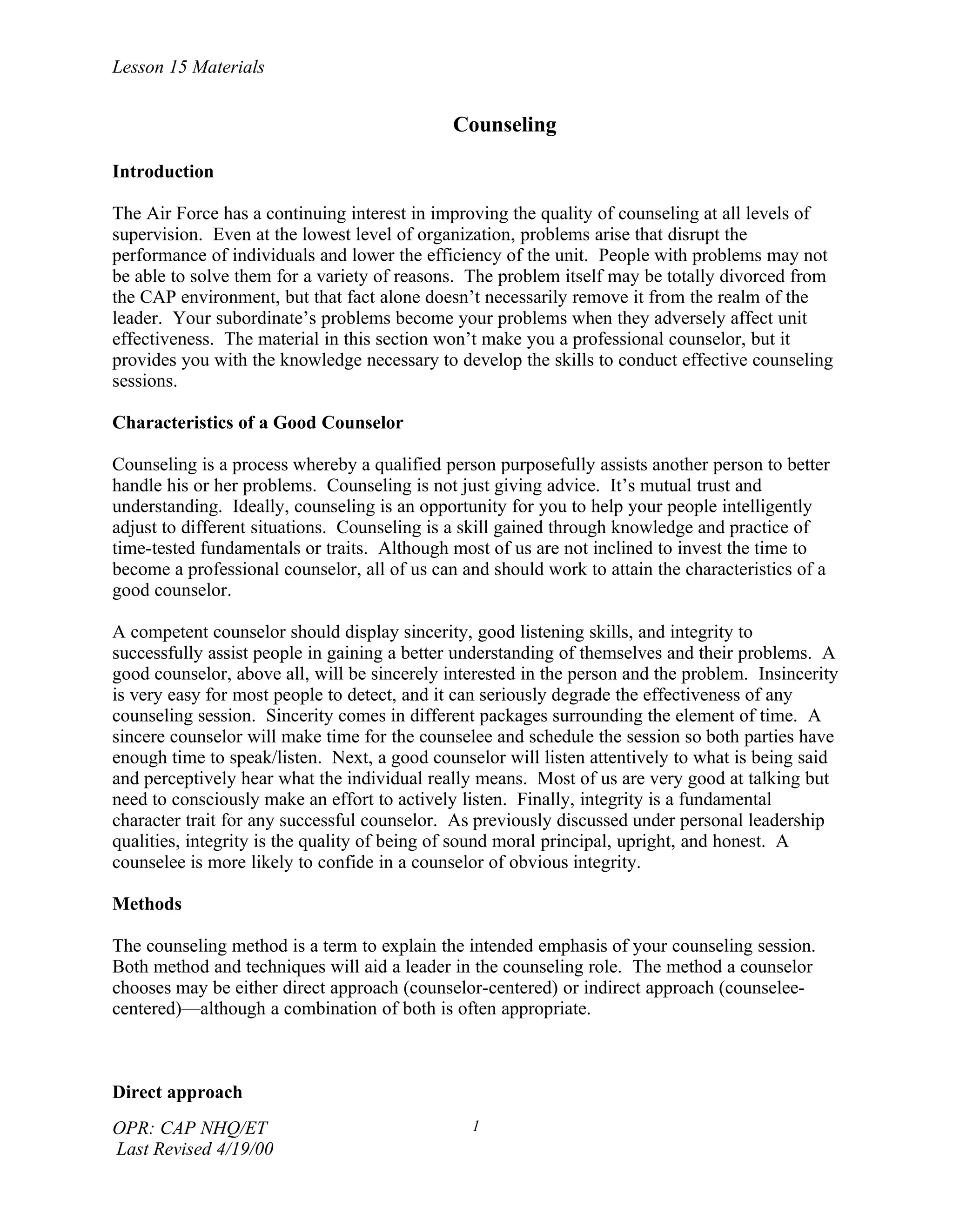 The document discusses counseling techniques for Air Force leaders. It emphasizes that counseling is a process of assisting others through mutual trust and understanding, rather than just giving advice. A good counselor displays sincerity, active listening skills, and integrity. Counseling methods can be direct, with the counselor taking initiative to identify and resolve problems, or non-directive, allowing the counselee to freely express themselves. Effective counseling techniques include asking open-ended questions, providing encouragement, and being aware of nonverbal communication. A counseling plan should include clear objectives, an appropriate method, and an opening statement to set the tone.