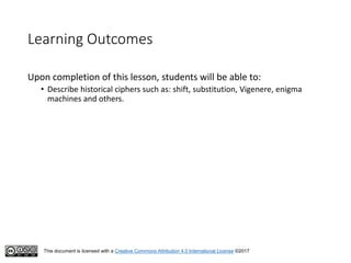 This document serves as an introduction to classical cryptography, covering various historical ciphers such as the Caesar cipher, Vigenère cipher, and Enigma machine. Students will learn about key concepts, encryption and decryption processes, and the vulnerabilities of these methods against modern analysis techniques. While these ciphers were effective in their time, they are now easily cracked using frequency analysis and pattern recognition.