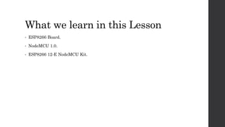 This document provides an overview of the NodeMCU course and ESP8266 development boards. It discusses the ESP8266 chip, the NodeMCU 1.0 development board, and the ESP8266 12-E NodeMCU kit. The ESP8266 is a low-cost WiFi-enabled microcontroller that is commonly used in IoT projects. It has an integrated TCP/IP stack and supports various protocols. The NodeMCU boards make it easy to program the ESP8266 chip and interface with inputs and outputs. The document describes the components and pinouts of the NodeMCU boards and how to interface with GPIO, I2C, SPI, PWM and analog pins.