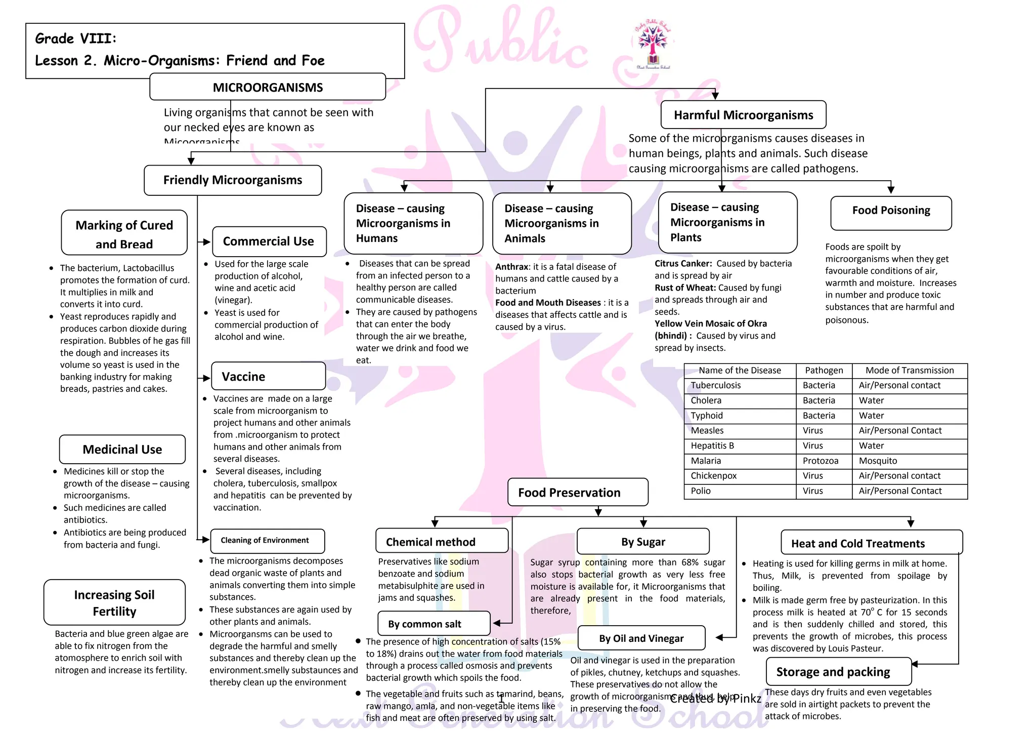 This document discusses microorganisms and their roles as both helpful and harmful to humans and the environment. It describes how certain microorganisms like Lactobacillus and yeast are used in food production to make curd, bread, alcohol, and more. It also explains how microorganisms can cause diseases in humans, animals, and plants. Pathogens and the diseases they cause like anthrax, foot and mouth disease, and yellow vein mosaic are identified. Methods of preventing disease transmission and food spoilage through techniques like vaccination, antibiotics, food preservation, and sanitation are outlined.
