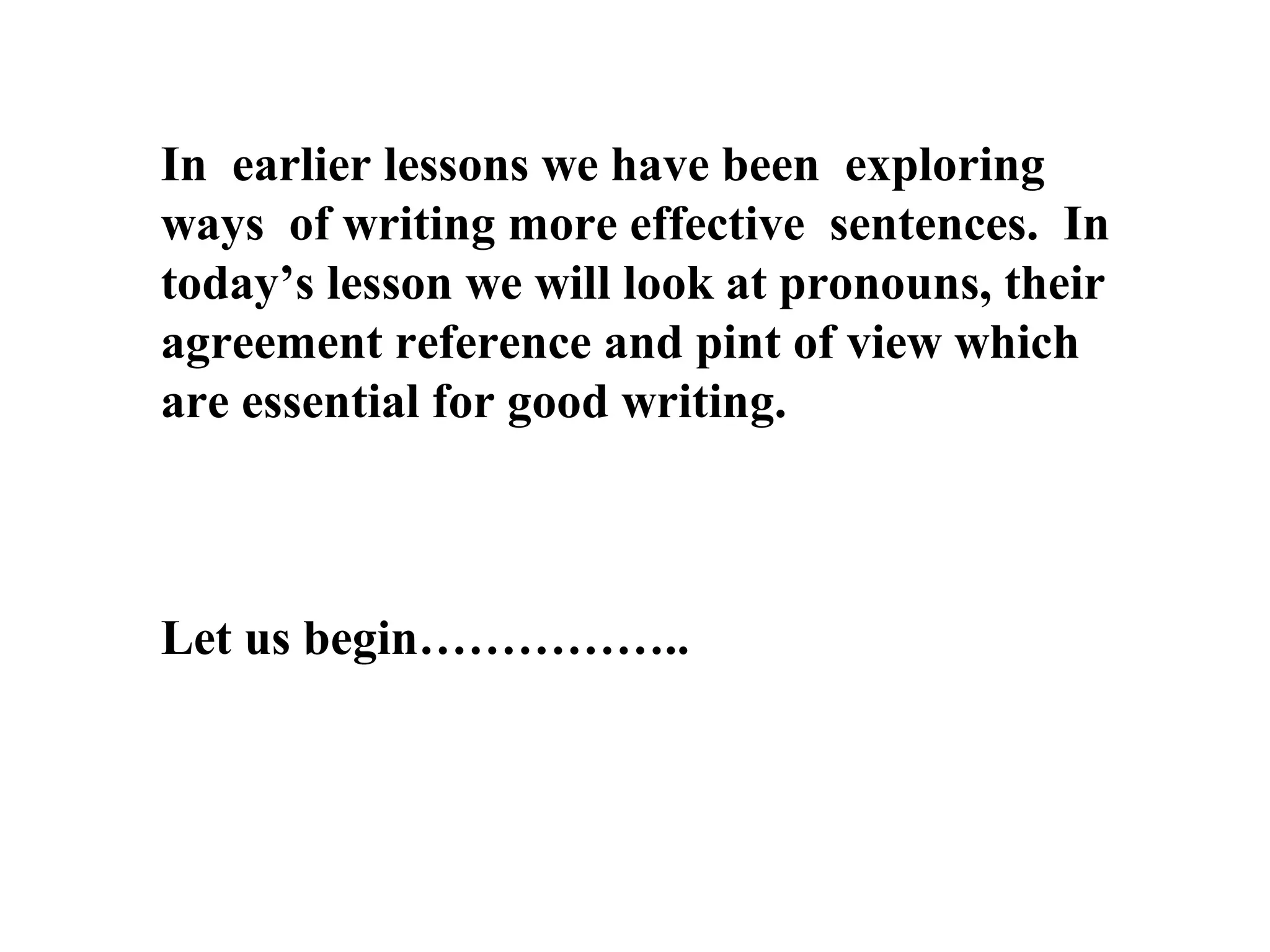 This document provides a lesson on pronouns, focusing on agreement, reference, and point of view. It discusses how pronouns must agree in number with their antecedents and refers clearly to a single noun. Examples are given of pronoun mistakes and their corrections. Students are given practices to identify pronoun errors and rewrite sentences fixing the errors. The lesson emphasizes the importance of consistent pronoun usage for clear communication.