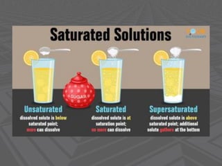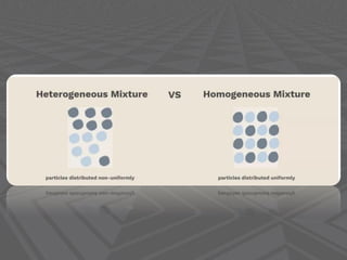 This document provides an overview of solutions and mixtures. It defines key terms like homogeneous and heterogeneous mixtures, solutes and solvents, concentration, and solubility. It also discusses different units used to measure concentration, including molarity, molality, and percent composition. Methods for separating mixtures like distillation, filtering, and chromatography are also outlined. The document provides examples of calculating concentration using various units and solving stoichiometric problems involving solutions.