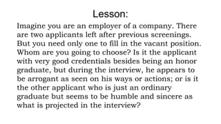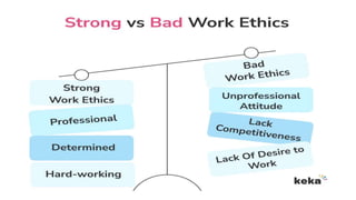 The document discusses work ethics, including defining it, characteristics of good work ethics, and examples of good and bad work ethics. It defines work ethics as a group of moral principles or standards of behavior regarding proper conduct in the workplace. Some characteristics of good work ethics are being professional, determined, hardworking, dedicated, prioritizing tasks, meeting deadlines, and serving as a role model. Examples of good work ethics include being punctual, completing tasks on time, and avoiding distractions. In contrast, examples of bad work ethics are having unprofessional relationships, engaging in gossip, being negligent, and displaying hostility towards managers. The importance of work ethics is also discussed.