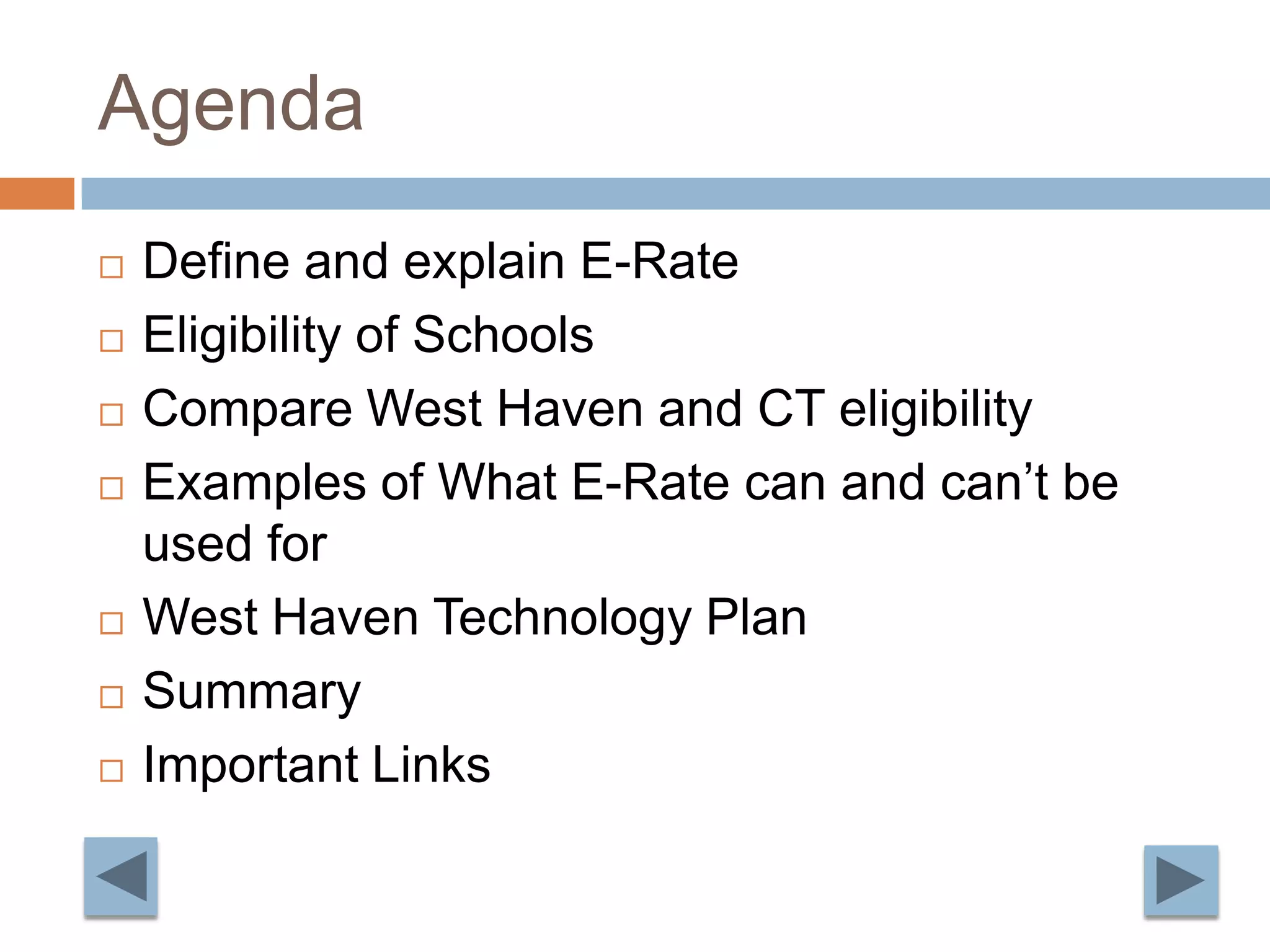 E-Rate is a federal program that provides discounts for internet and telephone services to schools and libraries. Eligibility is based on the percentage of students who qualify for free or reduced lunch. West Haven schools have a 45% free/reduced lunch rate and are eligible for E-Rate discounts of around 50% as an urban district. E-Rate funds can be used for internet connections, basic phone service, routers, switches and wireless networks but not items like software, computers or fax machines. West Haven's technology plan outlines goals like improving student achievement through technology, ensuring teacher technology proficiency, and developing infrastructure to support educational needs.
