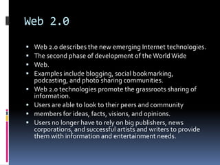 This document discusses various Web 2.0 and Library 2.0 technologies. It defines Web 2.0 as the second phase of development of the World Wide Web that promotes user participation and grassroots sharing of information. Examples provided include blogging, social bookmarking, podcasting, and photo sharing. Library 2.0 is described as a concept that makes information available wherever and whenever users need it, and ensures barriers to use are removed. Key elements of Library 2.0 discussed are being user-centered, providing a multimedia experience, being socially rich, and being communally innovative. Specific Web 2.0 technologies summarized include blogs, microblogs, music sharing, photo sharing, RSS feeds, social bookmarking, social networks,