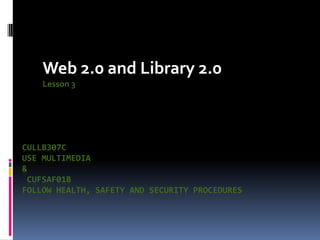 This document discusses various Web 2.0 and Library 2.0 technologies. It defines Web 2.0 as the second phase of development of the World Wide Web that promotes user participation and grassroots sharing of information. Examples provided include blogging, social bookmarking, podcasting, and photo sharing. Library 2.0 is described as a concept that makes information available wherever and whenever users need it, and ensures barriers to use are removed. Key elements of Library 2.0 discussed are being user-centered, providing a multimedia experience, being socially rich, and being communally innovative. Specific Web 2.0 technologies summarized include blogs, microblogs, music sharing, photo sharing, RSS feeds, social bookmarking, social networks,