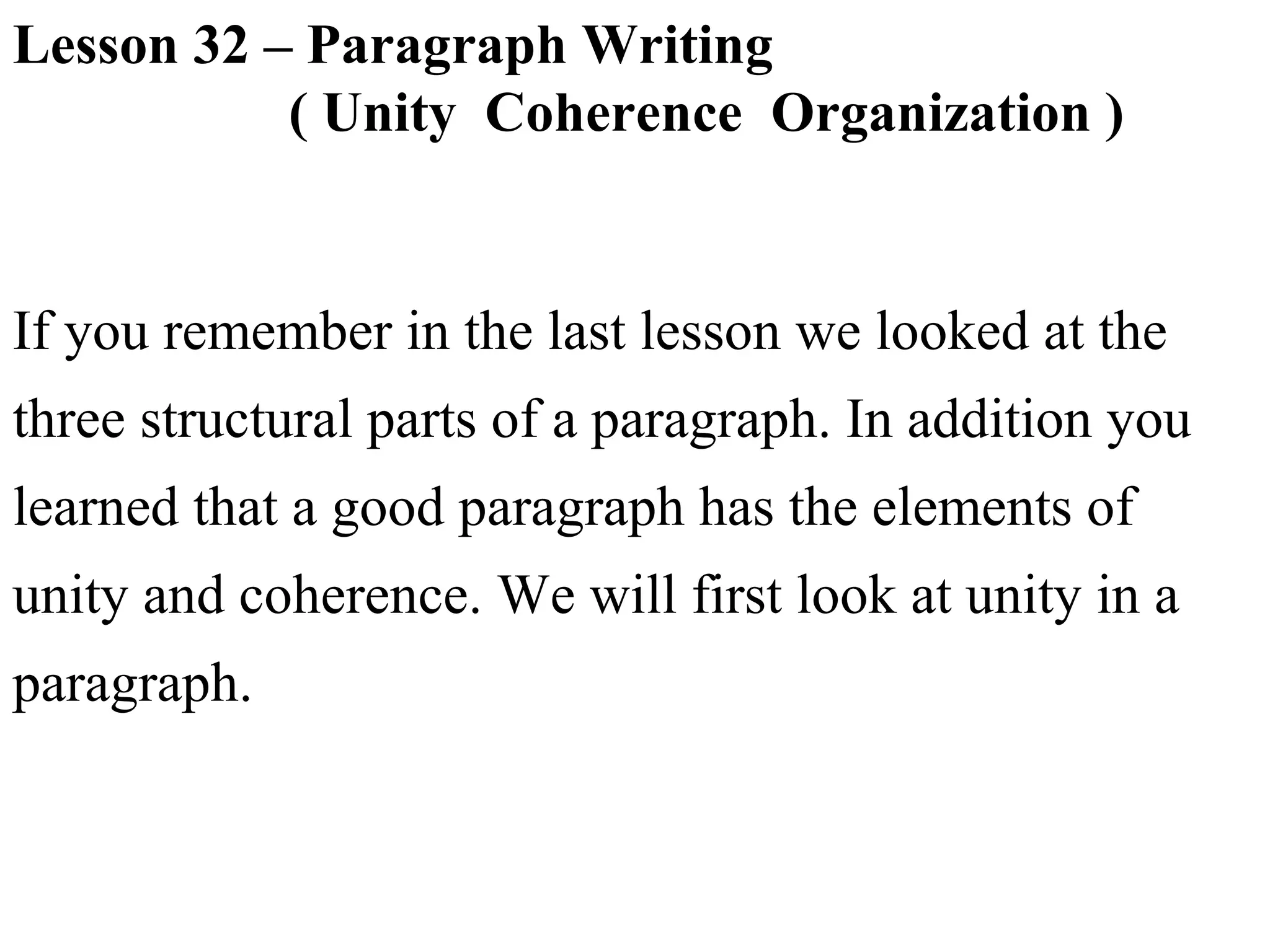 This document provides instruction on writing paragraphs. It discusses the importance of unity, coherence, and organization in paragraphs. Unity means a paragraph should have a single main idea, and all sentences must directly relate to and support the main idea. Coherence refers to the logical flow and connection between sentences. It can be achieved through transition signals and logical ordering of ideas. Common logical orders include chronological order and order of importance. The document provides examples and exercises to help understand how to write unified and coherent paragraphs.