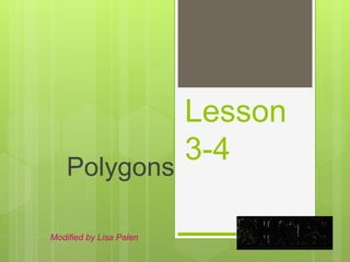 This document provides information about polygons, including definitions, classifications, names of polygons based on number of sides, properties of interior and exterior angles, and formulas to calculate sums and measures of angles. It defines a polygon as a closed figure formed by line segments that intersect only at endpoints. Polygons are classified as regular, irregular, convex, or concave. Common polygon names are provided for up to 12 sides. Formulas are given for calculating the sum of interior and exterior angles based on the number of sides of the polygon.