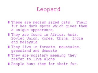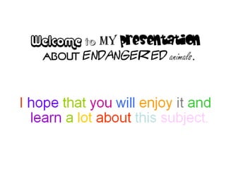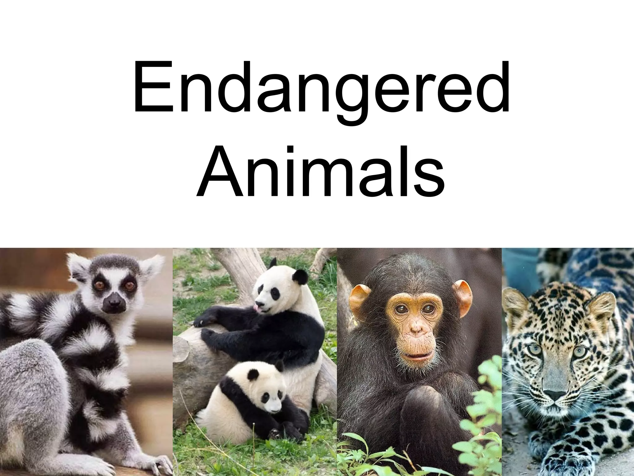 Giant pandas, rhinoceros, mountain gorillas, and tigers are endangered species. Giant pandas only have 1,600 left in the wild and have lost their habitat in China. Rhinoceros can weigh up to 8,000 pounds but are hunted for their horns, and mountain gorillas have dwindled to fewer than 650 due to forest destruction. Tigers are the largest cat but several subspecies are already extinct, and the remaining populations of other types such as South Chinese and Siberian tigers number only in the few dozens.