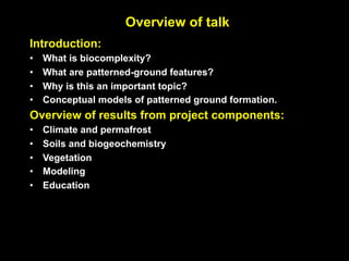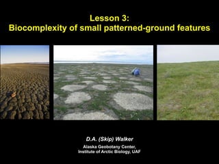 This document discusses biocomplexity of small patterned-ground features in Arctic ecosystems. It introduces patterned ground and describes the goal of understanding the complex linkages between frost heave, vegetation, disturbance and climate across the Arctic. It then provides an overview of various patterned ground forms seen along the Arctic climate gradient, from small polygons to earth hummocks, and discusses complexities caused by factors like slope, soil moisture and rockiness. Finally, it distinguishes between desiccation cracking and seasonal frost cracking as causes of small contraction-crack polygons common in the High Arctic.
