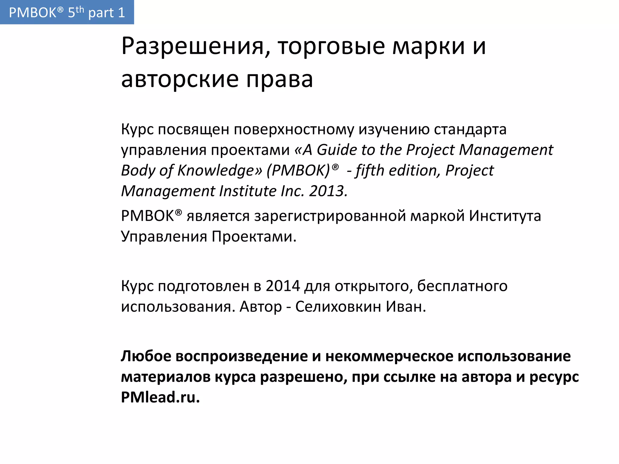 Документ представляет собой курс о стандарте управления проектами PMBOK® 5-го издания, разработанный Иваном Селиховкиным для открытого использования. Курс охватывает основные процессы и структуры PMBOK®, ориентируясь на их применение в практике управления проектами и подготовку к экзамену PMP. Основное внимание уделяется разработке планов, мониторингу и контролю работ проектов, а также управлению временем, стоимостью и содержанием проекта.