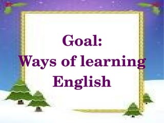 This document discusses ways of learning English, including greeting, writing, talking, listening, reading, and using language over time. It explains the difference between the present perfect simple and present perfect continuous tenses. Learners are asked to write example sentences using these tenses for homework. The goal is to provide an overview of methods for learning English and grammar concepts.