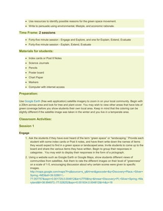 This lesson plan teaches 4th grade students about climate change, the greenhouse effect, carbon footprints, and ways to reduce their impact through two 45-minute sessions. In the first session, students explore green spaces in their community and reasons for green space movements. They learn about lifestyle, economic, and environmental benefits. In the second session, students explain their understanding of these benefits and suggest ways to make specific areas greener through a letter to local leaders. They evaluate their knowledge through this letter and illustrating green space benefits. The plan encourages students to observe green spaces in their neighborhoods.