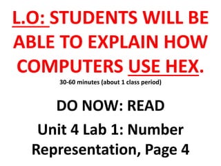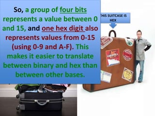 This document explains how computers use hexadecimal (hex) to represent binary numbers. It discusses how 4 binary bits can represent a single hex digit from 0 to 15. The document provides examples of translating binary numbers to hex and vice versa using conversion tables. It also explains how RGB color values are represented in hex, with each color component ranging from 00 to FF in hex notation.