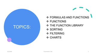 This document provides an overview of advanced Excel tools for processing and presenting data. It discusses formulas and functions, the function library, sorting, filtering, and charts. The lesson aims to teach constructing formulas, organizing data using sort and filter, and representing data in charts. It also includes an example of using a formula with cell references to calculate profit from a sales report. Finally, it covers functions, their parts and arguments, and provides examples of common functions like SUM, AVERAGE, COUNT, MAX, and MIN.