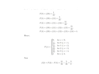 The document provides an overview of random variables and probability distributions, emphasizing the distinction between discrete and continuous random variables. It includes examples and definitions of probability functions, mass functions, and cumulative distribution functions for different random variables. The document also discusses methods for calculating probabilities and the characteristics of distributions.