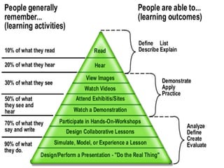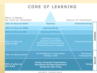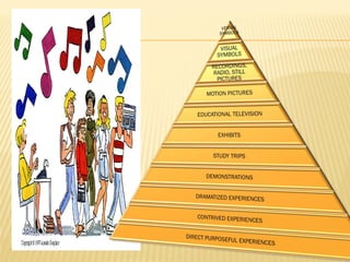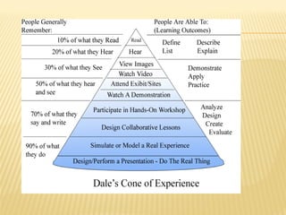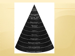 The document discusses Edgar Dale's Cone of Experience, which arranges various educational experiences from most concrete to most abstract. Direct experiences are closest to real life, while verbal symbols are the most abstract. The cone shows that mixing media which appeal to multiple senses helps learning. It cautions against overreliance on one type of experience and emphasizes moving between concrete and abstract. Bruner's model of enactive, iconic, and symbolic learning parallels the cone's arrangement from hands-on to abstract.
