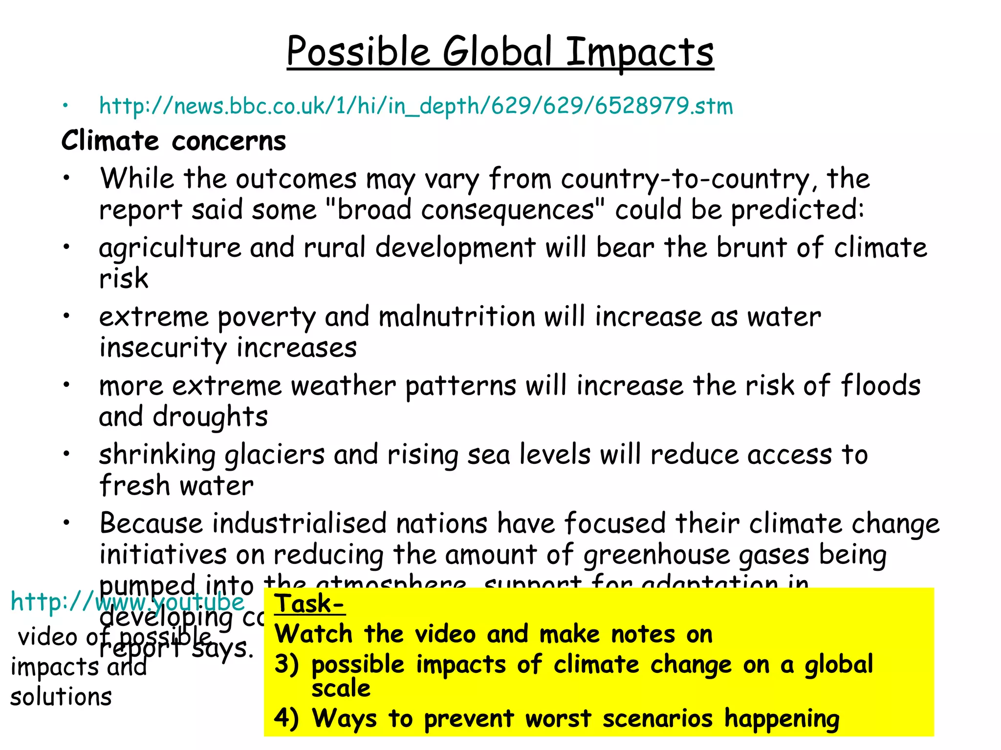 The document discusses the potential impacts of climate change around the world and in specific regions. Some key impacts that could occur globally include increased risks of food insecurity, water scarcity, and extreme weather events. Developing nations are expected to face greater challenges in adapting to climate change impacts. Specific regions may experience threats such as sea level rise endangering coastal communities, shifts in agricultural production, increased disease prevalence, and disruptions to water supplies from glacier melting. Bangladesh is highlighted as one country particularly vulnerable to climate change due to its low-lying geography and population density.