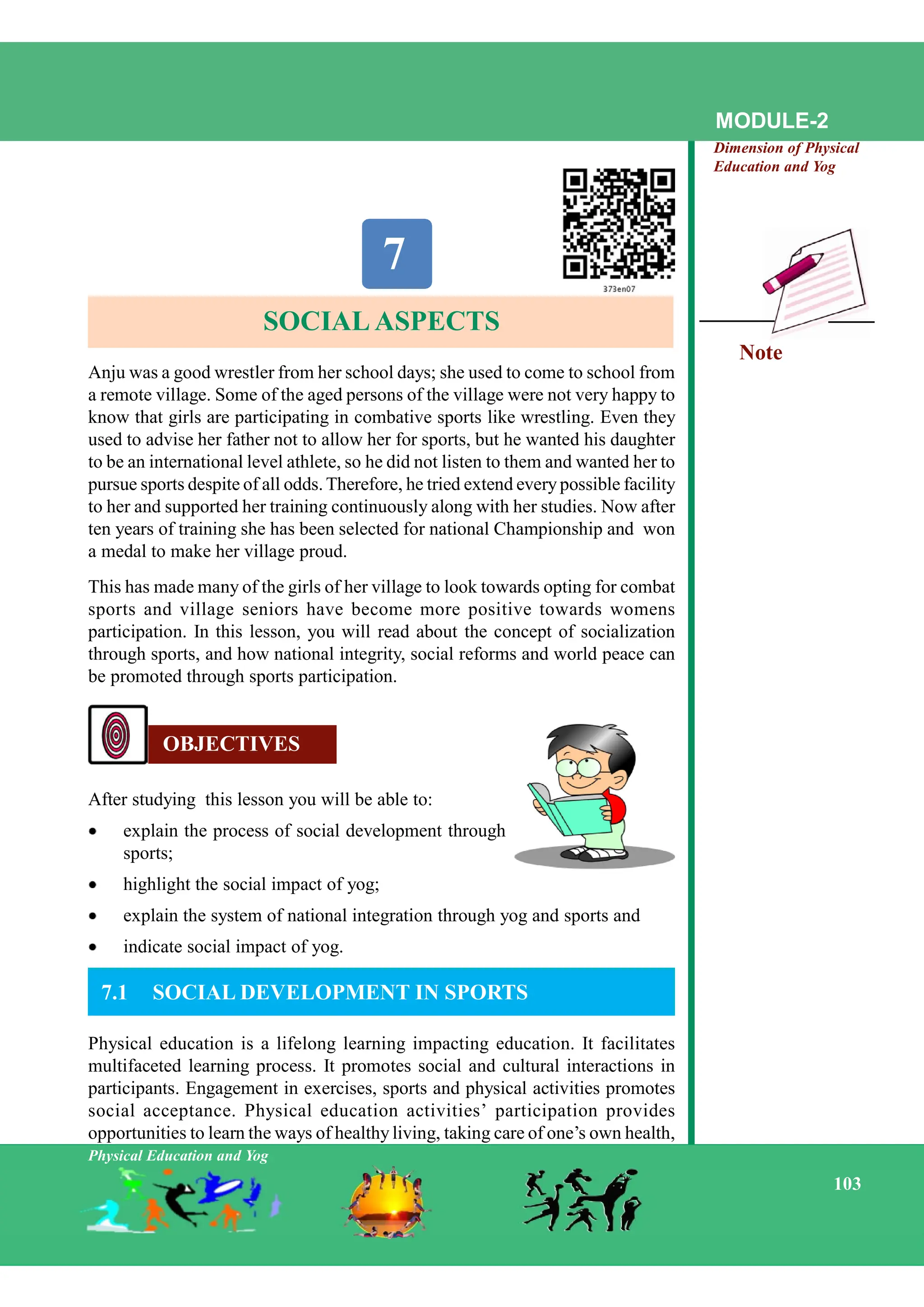 The document discusses the social aspects and impacts of physical education and yoga, exemplified through the story of Anju, a wrestler who inspired her village's positive view towards female participation in sports. It highlights the role of sports in socialization, national integration, and personal development while outlining the macro and micro concerns associated with sports sociology. Additionally, it emphasizes the importance of Olympic values and the transformative potential of yoga in fostering social well-being and community cohesion.