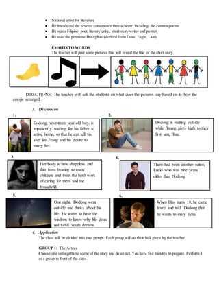 This document outlines a lesson plan to teach the short story "Footnote to Youth" by Jose Garcia Villa. The objectives are for students to consider things to consider before marriage, analyze pictures representing scenes from the story, and discuss the significance of the story. Key points from the story will be presented through pictures and a concept map. Students will then perform scenes from the story or songs representative of characters. Finally, students will generalize themes from the story and answer questions to evaluate their understanding before being assigned further readings and questions for homework.