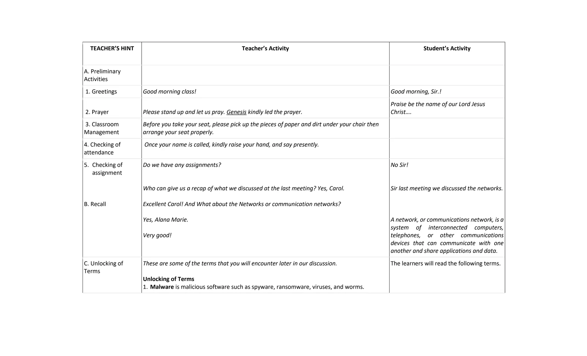 This lesson plan discusses cyber security threats and how to prevent them. It begins with introducing objectives like identifying cyber threats, learning how to minimize virus attacks, and explaining practices to quarantine threats. The teacher then defines key terms like malware, Trojan horses, worms, denial of service attacks, and phishing. Students watch a video on cyber threats and complete a graphic organizer to understand threats like malware, phishing, passwords attacks, and how to prevent them through practices such as unique passwords and updates. Finally, students make informative posters about cyber threats and prevention and present their work to the class.