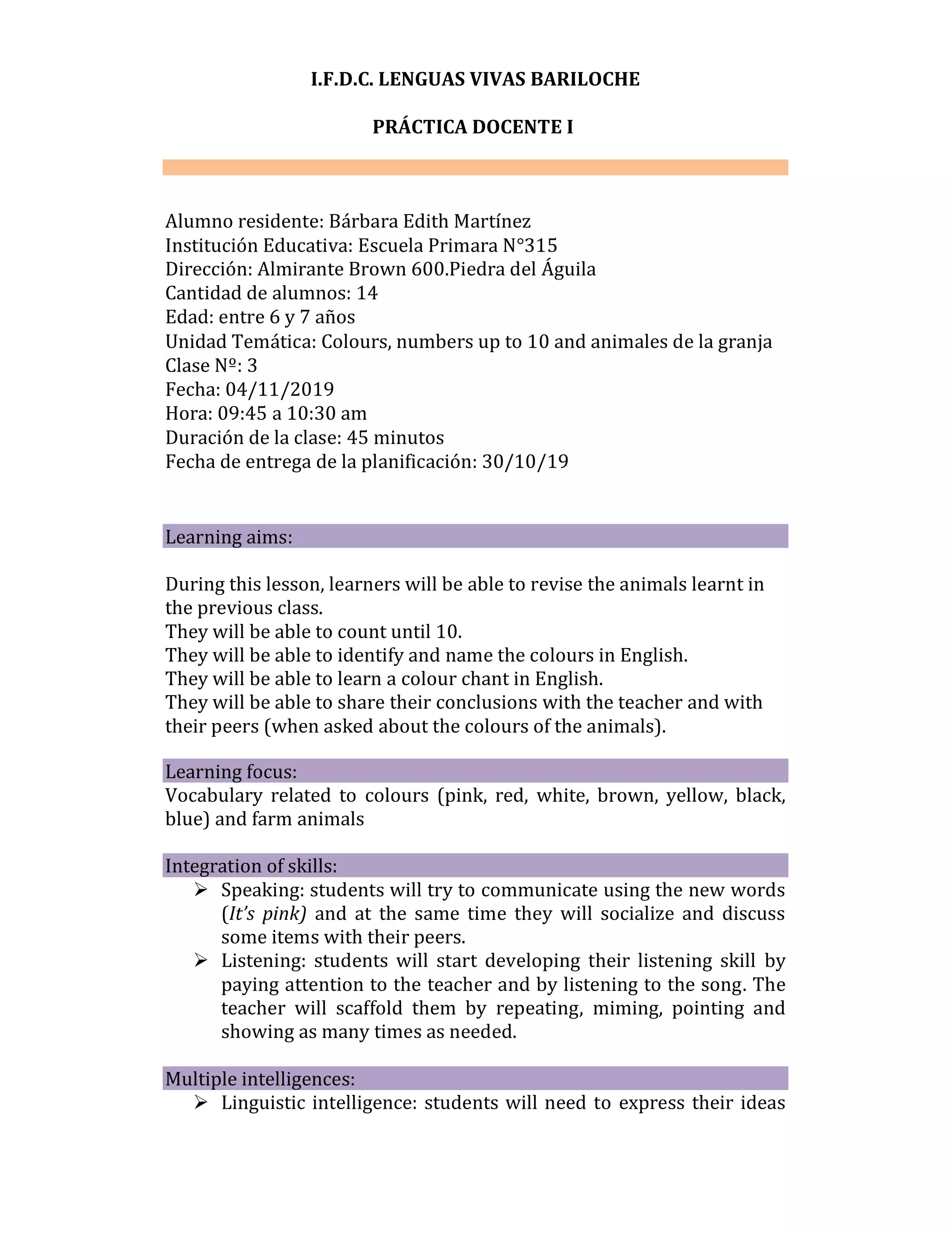 This document provides a lesson plan for a 45-minute English class for 14 6-7 year old students. The lesson aims to teach colours, numbers up to 10, and farm animals. It includes a variety of activities like greeting and warmup songs, a colour chant, connecting dots to identify animals and colours, and a closing "I Spy" game. The plan demonstrates scaffolding like repetition, gestures, and limiting L1 use. Assessment is through observation of students' language output.