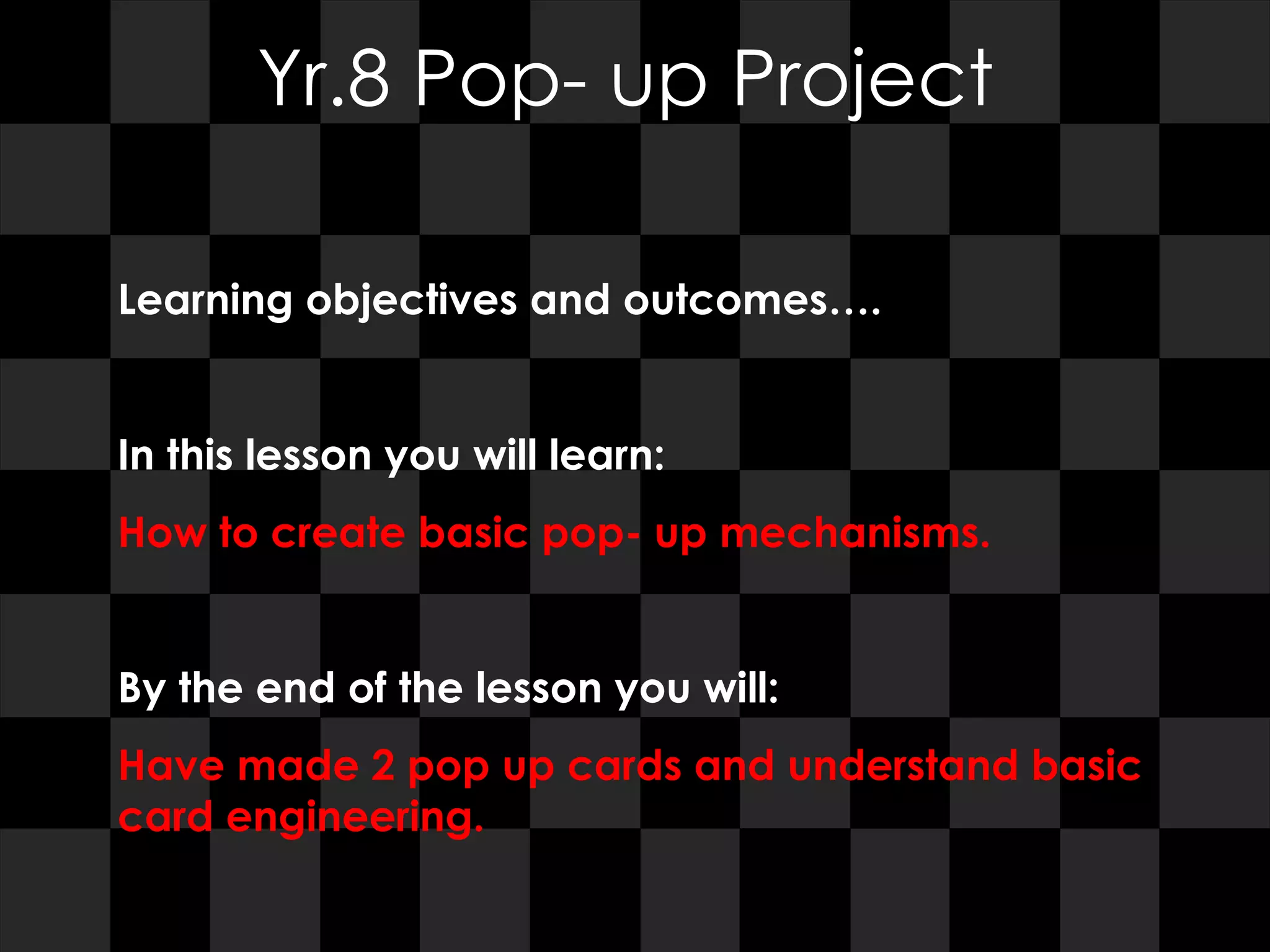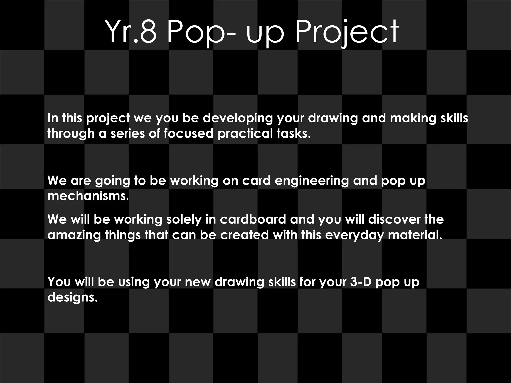 The document provides instructions for a Year 8 project on developing pop-up card and drawing skills using cardboard. Students will learn how to create basic pop-up mechanisms using techniques like V-folds. They will make two pop-up cards and understand card engineering basics. The project aims to help students learn pop-up design through practical tasks focused on drawing and constructing pop-ups solely with cardboard.