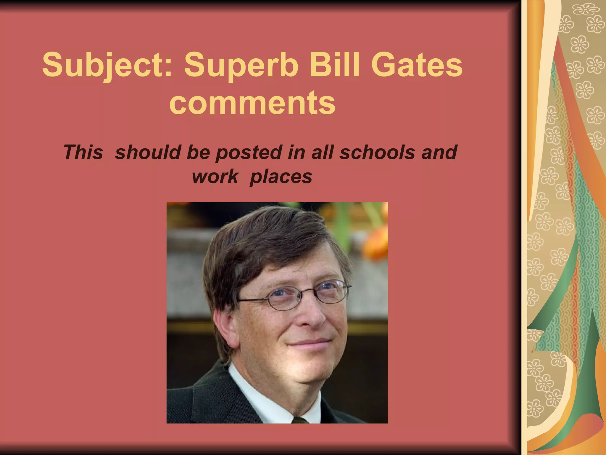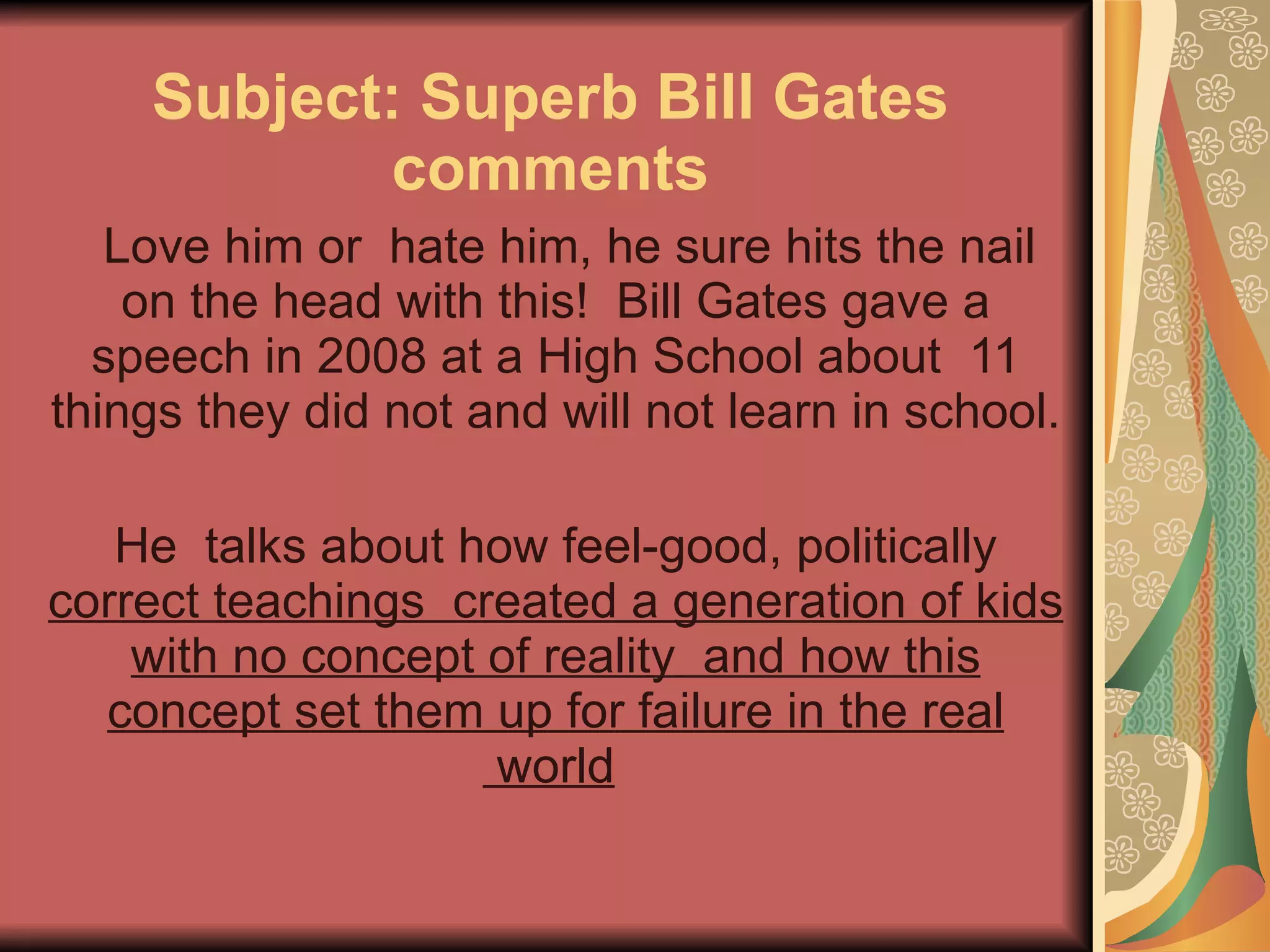 The document summarizes 11 rules that Bill Gates shared in a 2008 speech about things students do not learn in school. The rules emphasize that life is not fair, accomplishments take hard work, and school does not prepare students for the realities of the working world where there are winners and losers and employers do not help people find themselves. It also encourages students to be nice to intelligent "nerds" who may become their bosses.