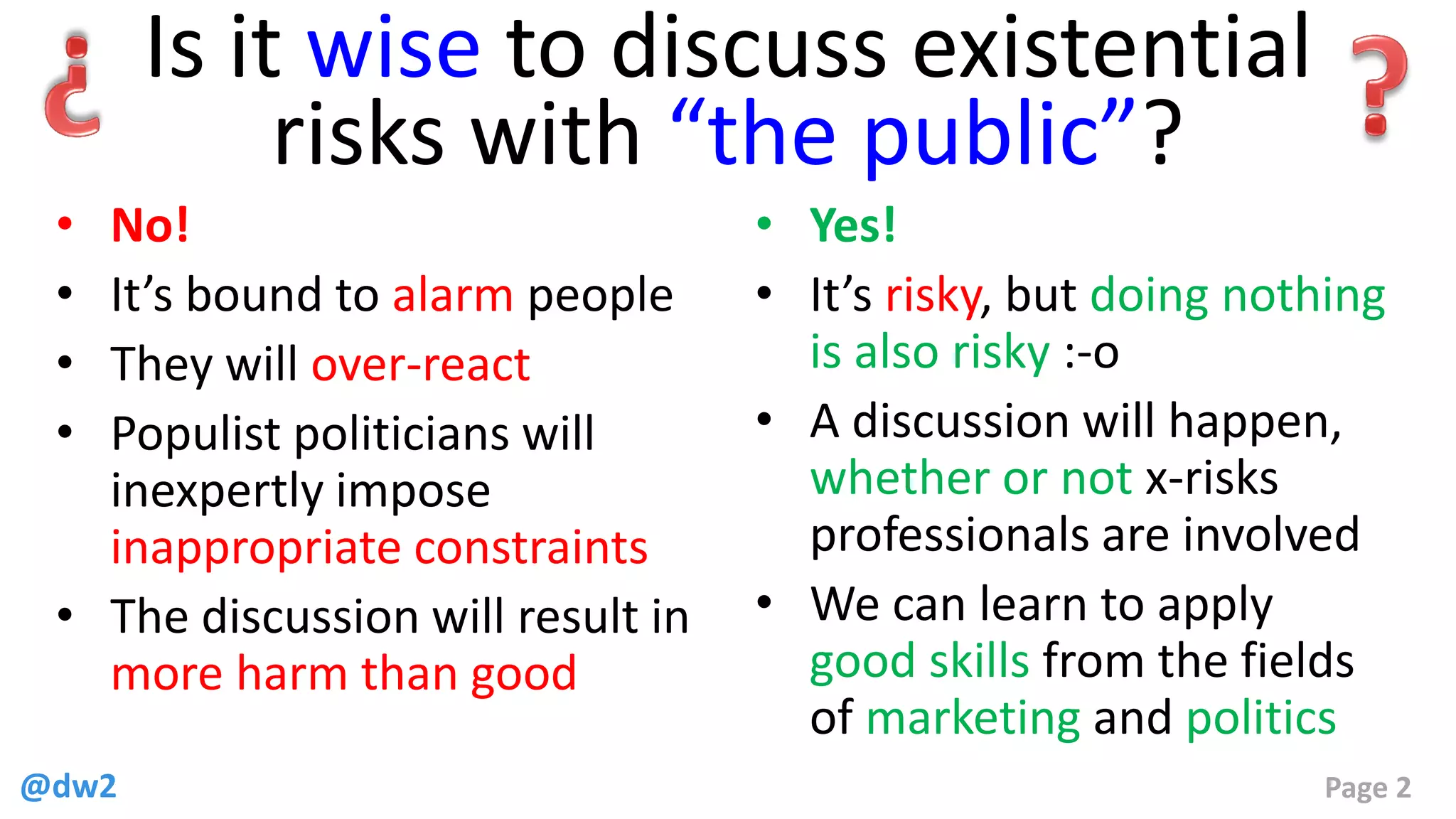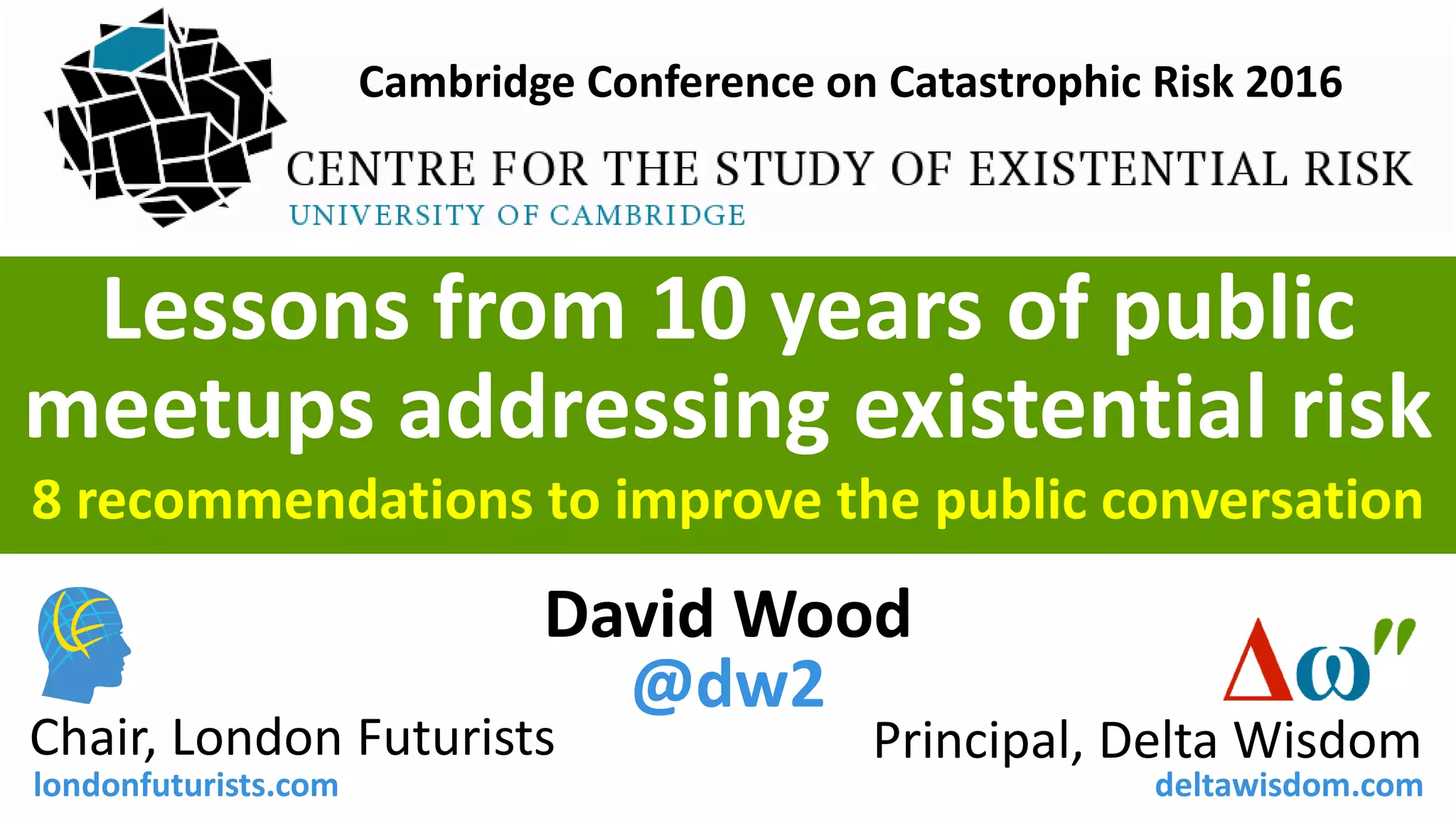 The document presents eight recommendations for improving public conversations about existential risks based on ten years of experience with public meetups. Key suggestions include engaging storytellers, focusing on real-world problems with ready solutions, and fostering political alliances. It emphasizes the importance of compelling narratives and agile development in addressing complex issues while also envisioning a post-scarcity future driven by advancing technology.