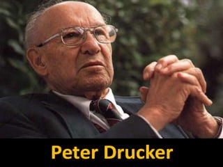 An established company must innovate or risk decline and extinction. Business has only two functions - marketing and innovation. The aim of marketing is to deeply understand customers so the product fits them and sells itself. To predict the future, organizations must create it through continual change, learning, and adapting to new opportunities. Effective leaders focus on strengths, make weaknesses irrelevant, and build on what works well.