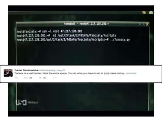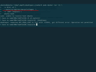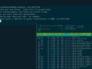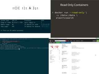 The document discusses security challenges and practices when running potentially malicious code in Docker containers, highlighting the risks of providing unrestricted access to hosted environments. It covers various vulnerabilities, container management, and security measures such as cgroups and namespaces to mitigate risks. The importance of maintaining secure practices for Docker and Elasticsearch is emphasized to avoid compromising systems.