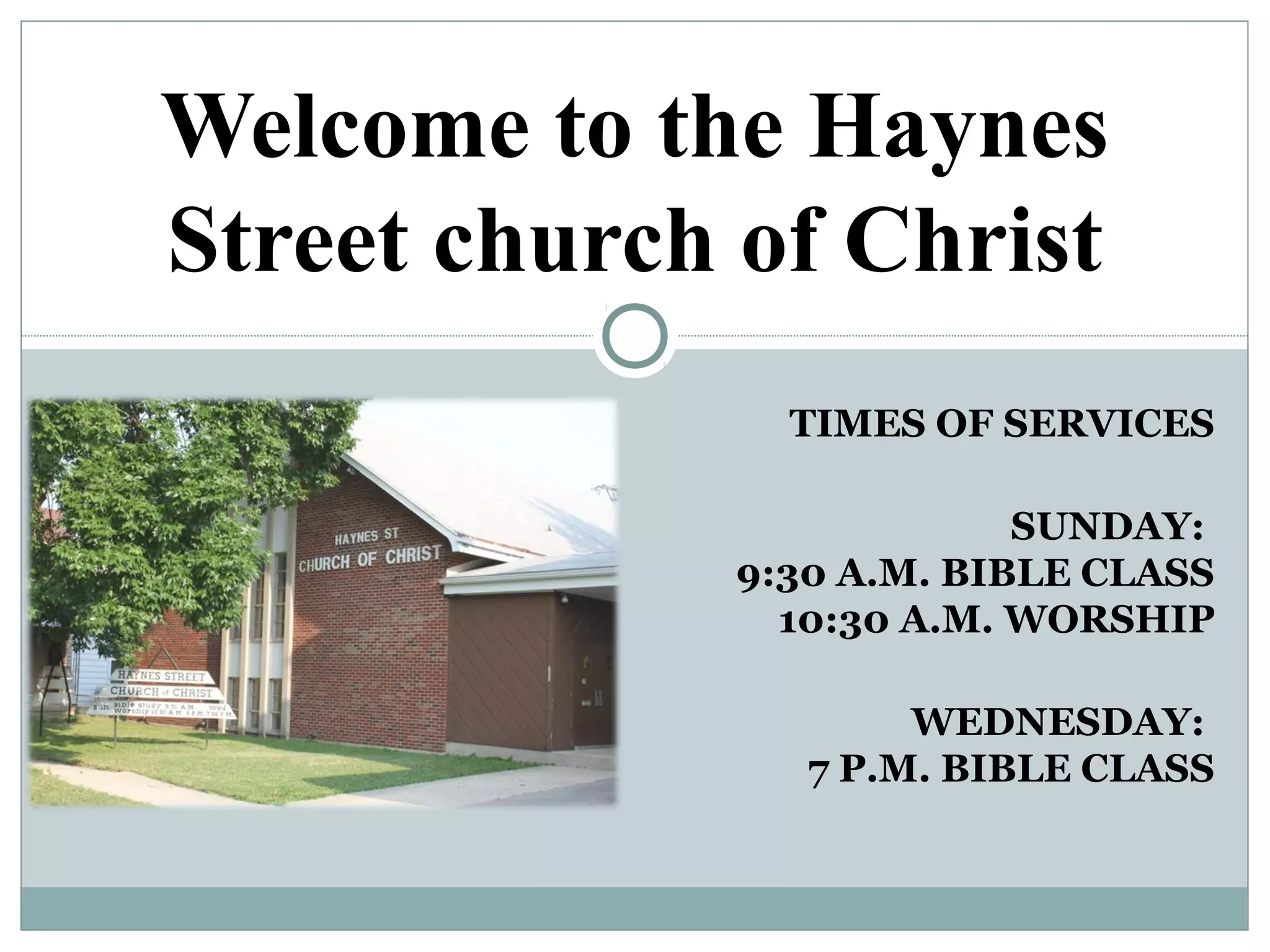 The document outlines the service times for the Haynes Street Church of Christ and discusses key teachings from the Sermon on the Mount, emphasizing the importance of building one's life on Jesus' words. It includes a summary of God's plan of salvation, which consists of steps such as hearing, believing, repenting, confessing, being baptized, and living faithfully. Additional points include the significance of treating others with kindness and the pursuit of righteousness exceeding that of the scribes and Pharisees.