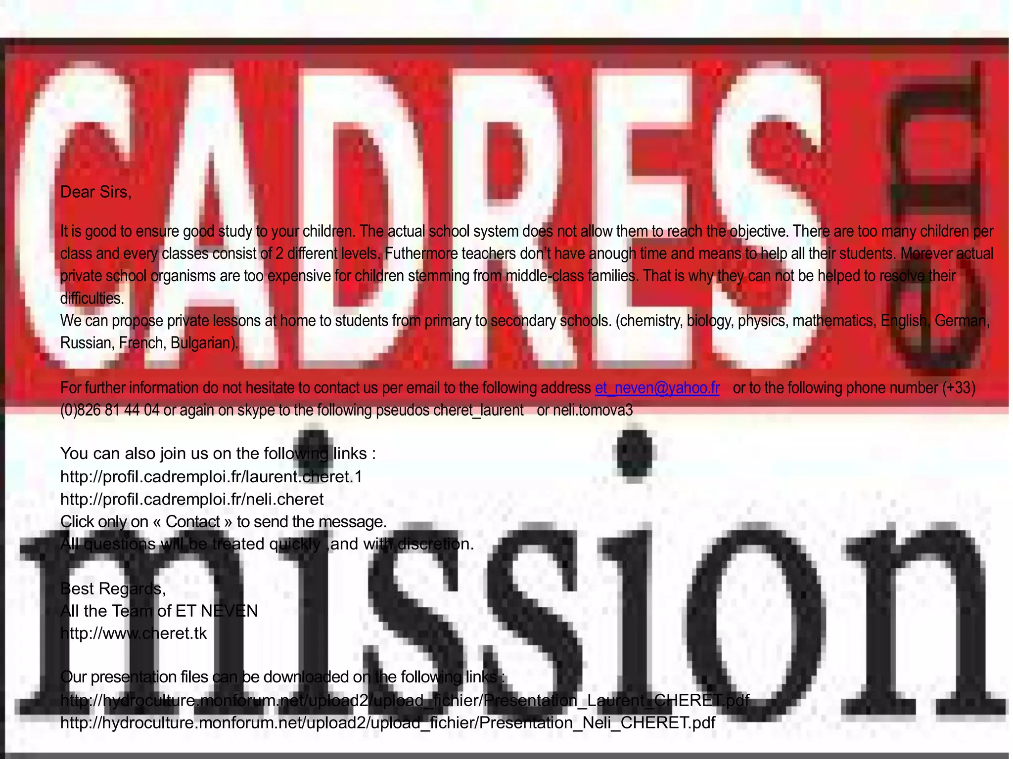 The document discusses offering private home lessons for students from primary to secondary school in various subjects like chemistry, biology, physics, mathematics, and languages. It notes that the actual school system does not allow children to reach their objectives due to large class sizes and mixed ability levels. Private schools are also too expensive for middle-class families. Contact information is provided to inquire further about the private home lessons via email, phone, or Skype.