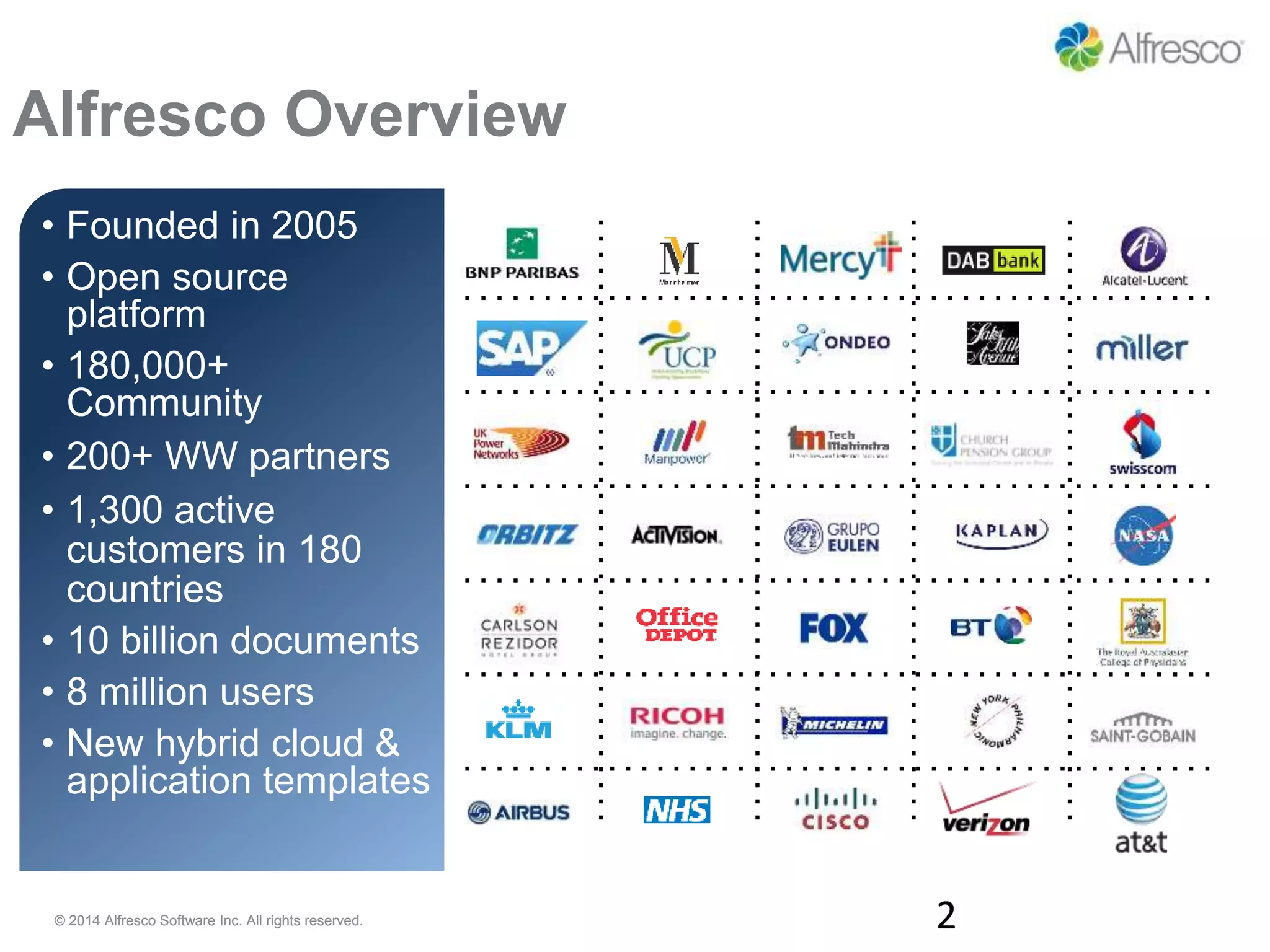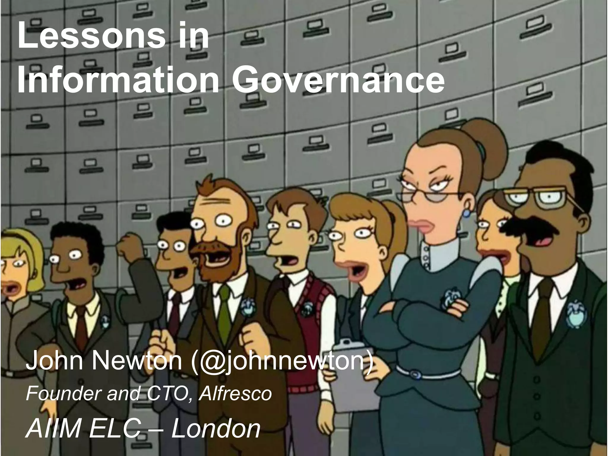 The document discusses lessons in information governance from a presentation given by John Newton, founder and CTO of Alfresco. Some key lessons are that closed systems are not always the most effective, strong governance is needed to make open collaboration work, zero tolerance policies do not work with users, effective governance should be invisible to users, and governance does not stop at organizational boundaries. Alfresco provides an open source content management platform and has over 180,000 community members, 200 partners, and manages over 10 billion documents for 1,300 customers in 180 countries.
