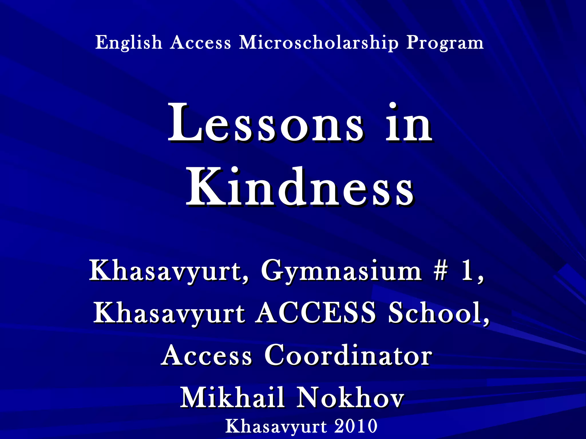 This document describes the "Lessons in Kindness" project carried out by ACCESS students in Khasavyurt, Russia from 2008-2009. Students wrote stories about kindness and respect that were compiled into a book. The book was well received by teachers and helped motivate students to learn English. It has since been introduced in schools across Russia and other countries to promote tolerance among young people. The project shows how student-created materials can be an effective way to teach English and positive values.