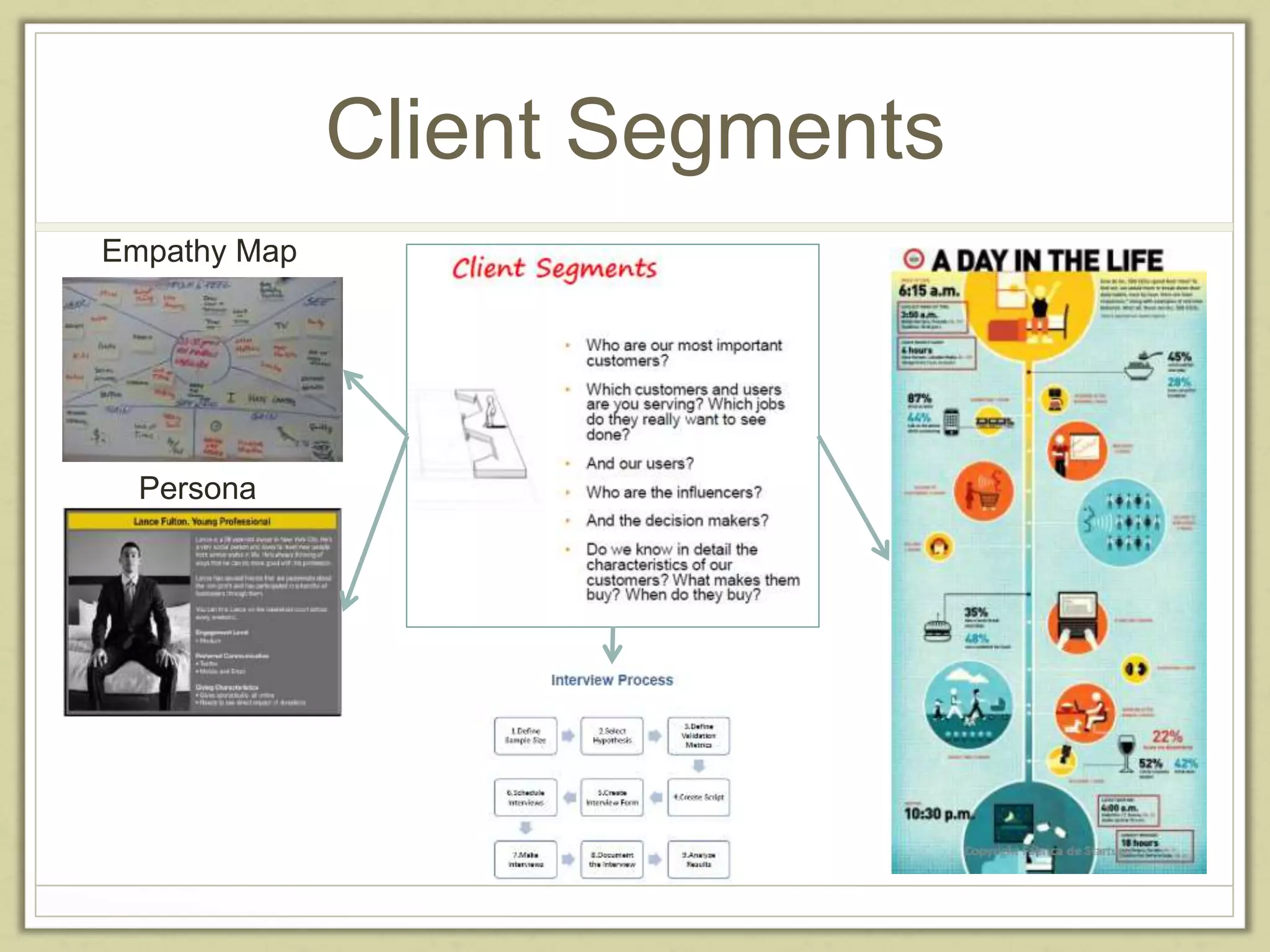 This document summarizes lessons learned from a lean entrepreneurship project focused on client segments. It includes an empathy map to understand key stakeholders, descriptions of two client personas ("Amy Pierce" and "George Novák"), and notes from interviews about sock purchasing habits. The interviews revealed that losing socks is a problem, mothers are the main purchasers of socks, and business people may value added features like socks that stay together.