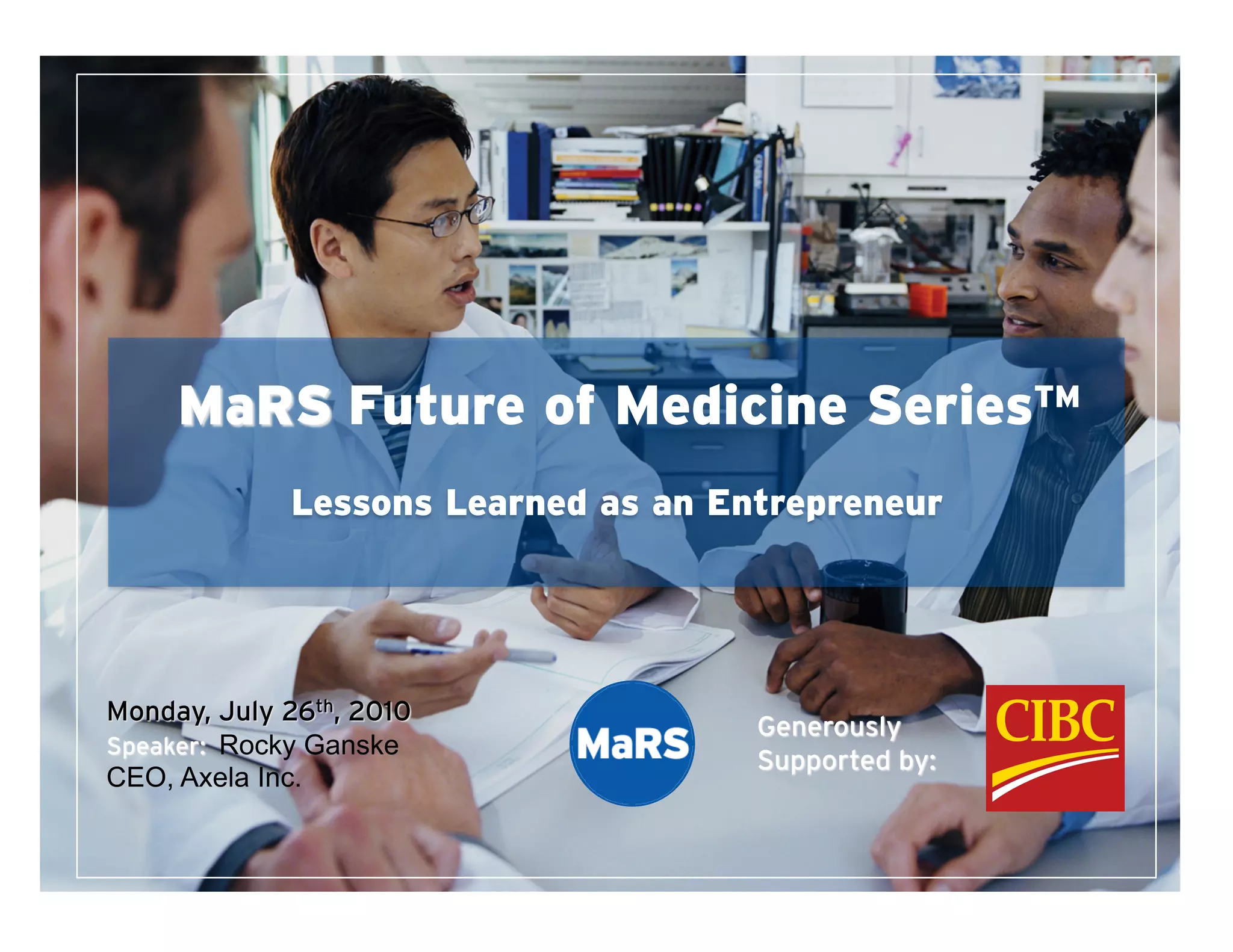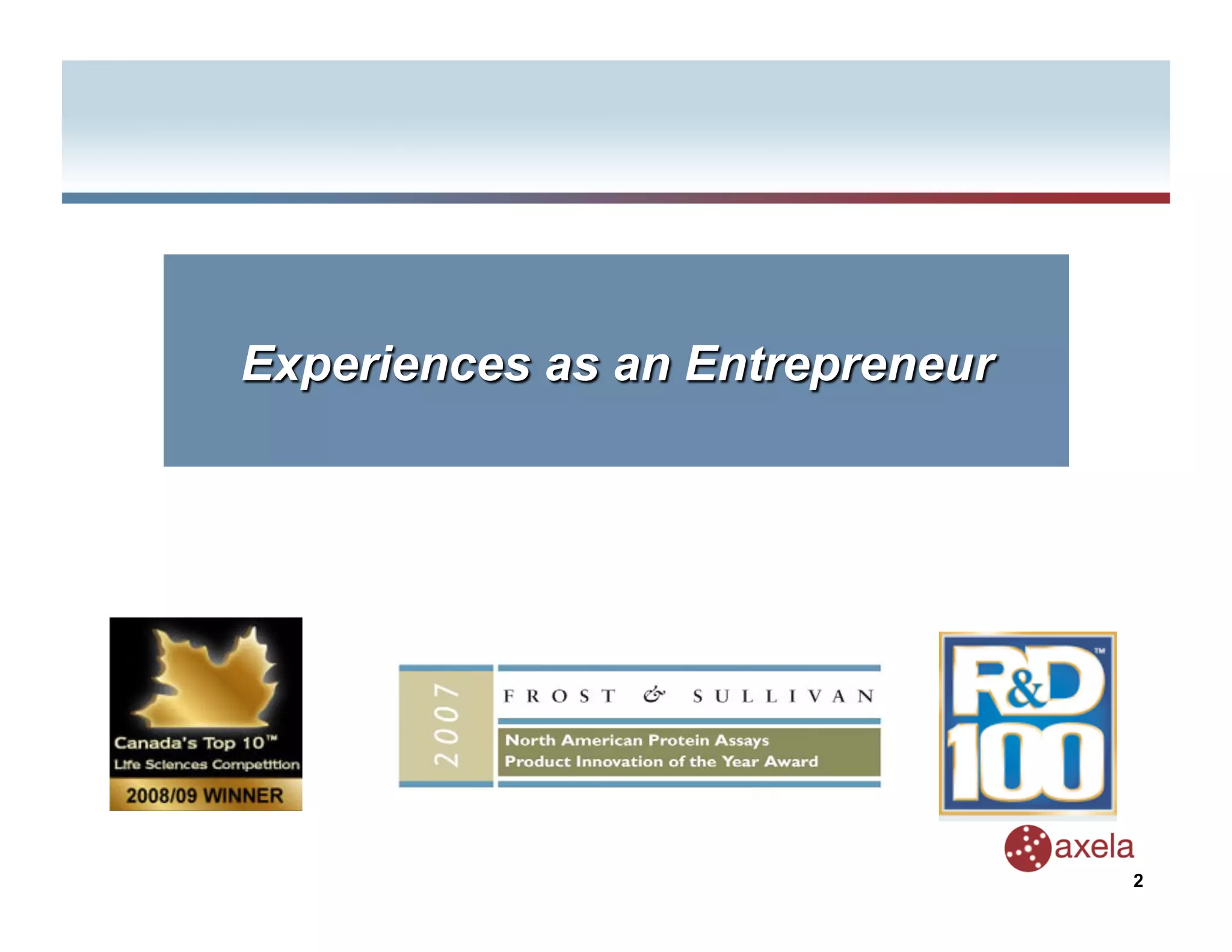 The document discusses lessons learned from being an entrepreneur over 30 years in the diagnostics and life science industry. It covers the challenges of startups, including that 60% of companies fail within 6 months, 82% fail by 10 years, and 90% of new products fail. Key lessons are to use a consistent process to assess progress, understand exit plans, have clear roles, be honest with expectations, and hire only the best people. It also discusses the technology development cycle and importance of cash, partnerships, communication, embracing change, and good management.
