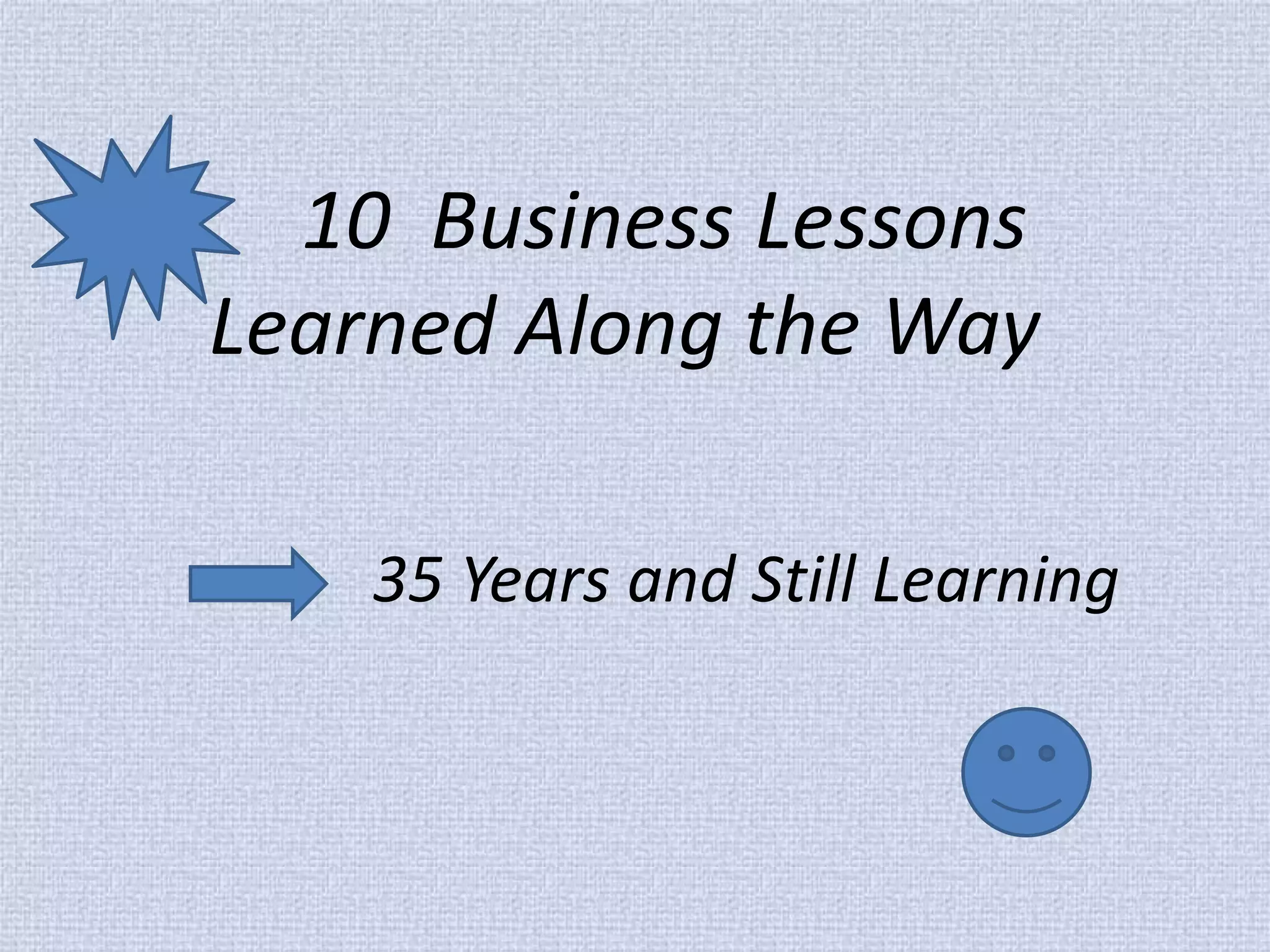 The document outlines 10 business lessons learned over 35 years including putting people first, finding and developing talent, building on strengths and embracing change. It emphasizes the importance of continuous learning and adapting to change. Key relationships and trust are vital for business success. Differentiation and passion are important to stand out. Failure should not be feared but learned from through risk-taking and exploration.