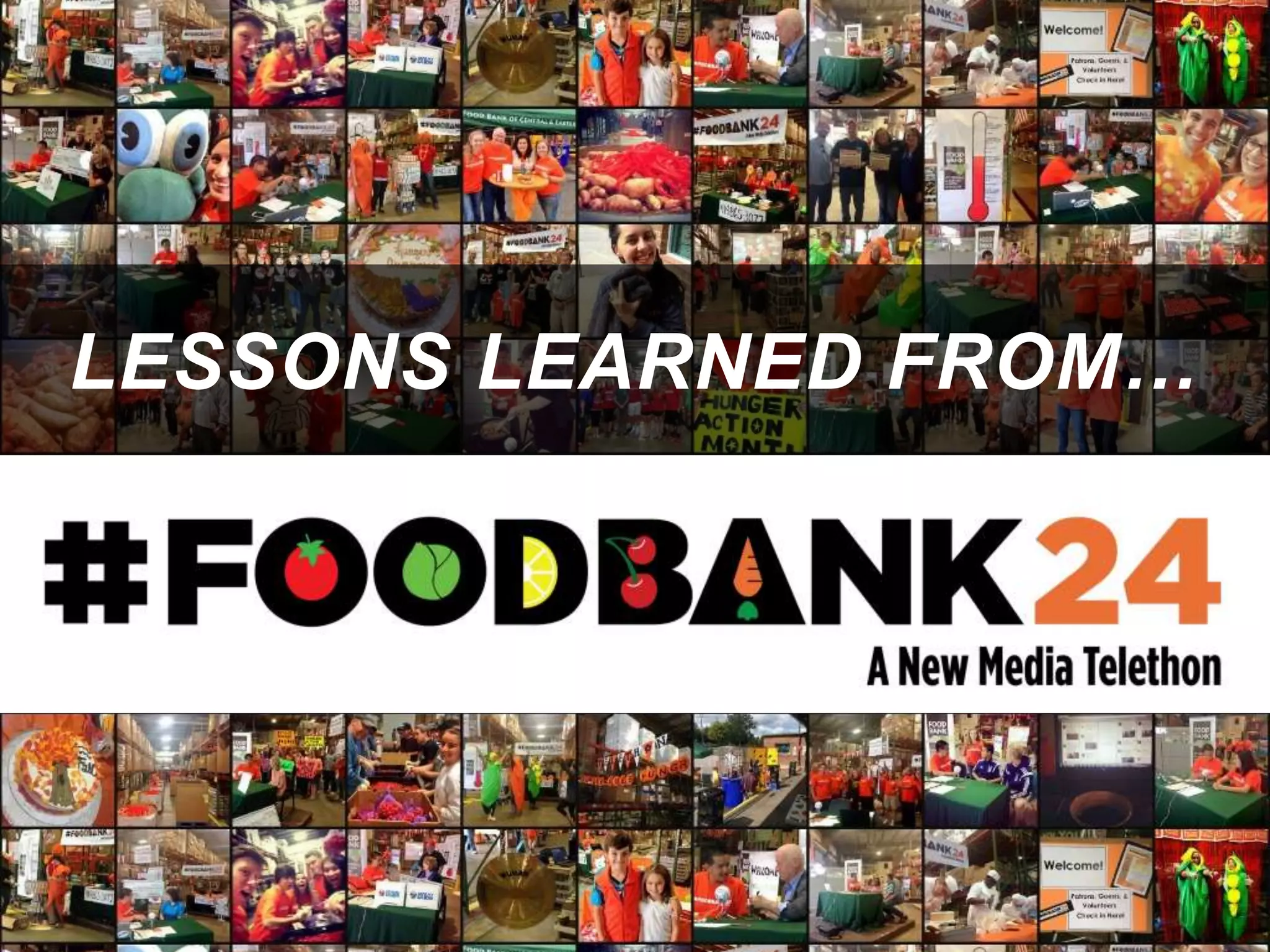 The document outlines lessons learned from a live streaming fundraiser called #foodbank24, aimed at hunger relief, highlighting the essential streaming needs and the importance of collaboration, scheduling, and goal focus. It provides a comprehensive marketing strategy that includes digital and traditional media tools, and emphasizes the role of social media ambassadors in promoting the event. The document concludes with a note on analyzing the results for future improvement.