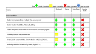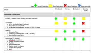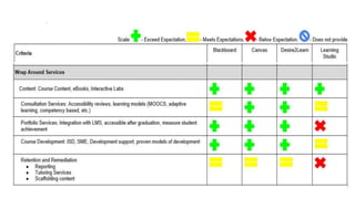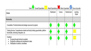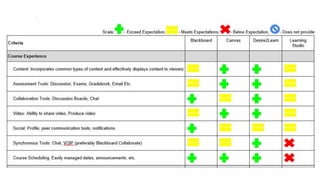 This document summarizes lessons learned from Northwestern University's review and selection of a new learning management system (LMS). It discusses the evaluation process, needs assessment, vendor selection, and lessons around scale, single sign-on, and transparency. Key needs included rich content, mobile experience, synchronous tools, and student engagement features. After reviewing four options, Blackboard was selected for its scale and capabilities. The migration process will involve course development with the vendor to fully leverage the new system. Training, support, and ongoing feedback were identified as important factors for success.