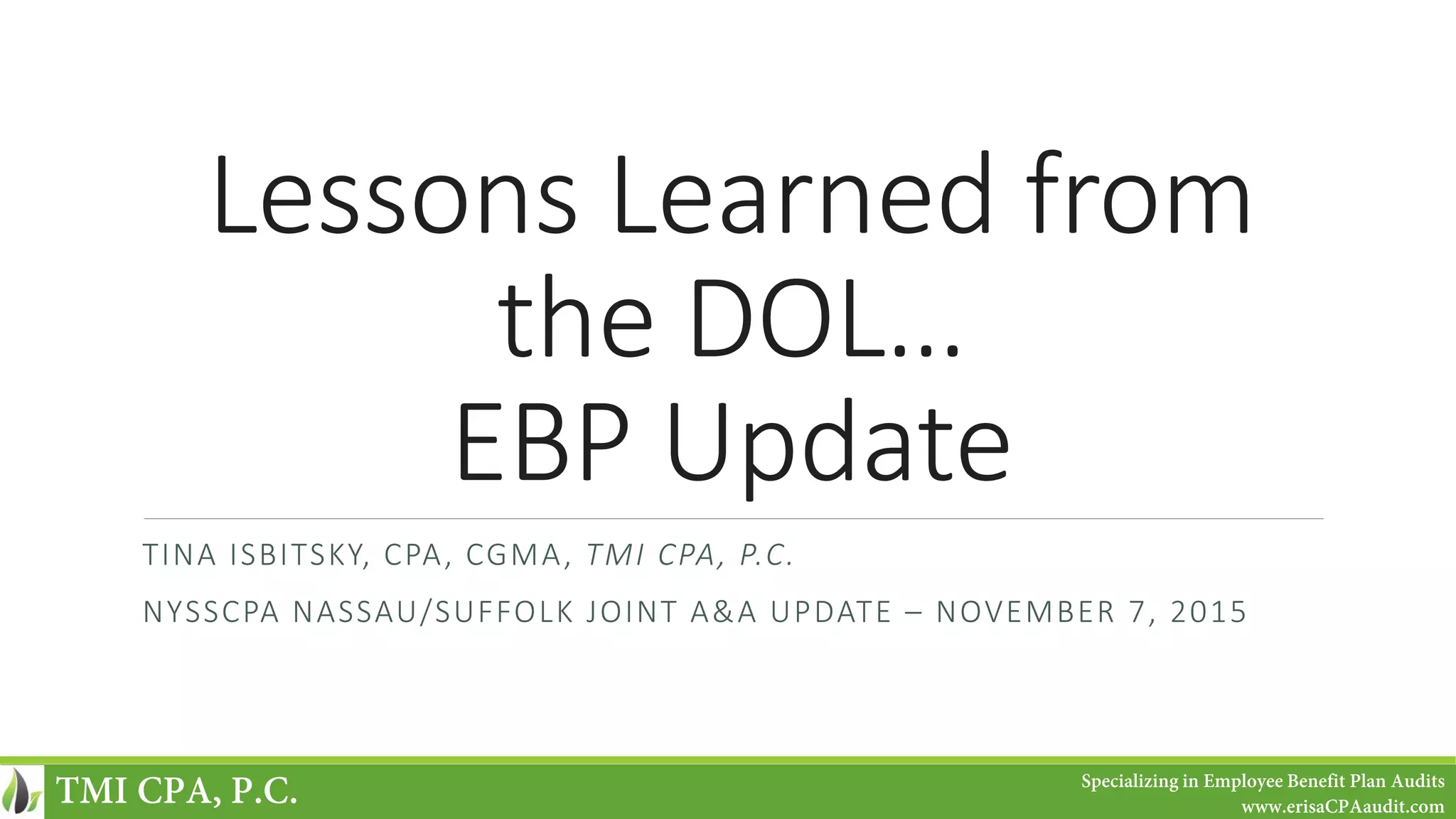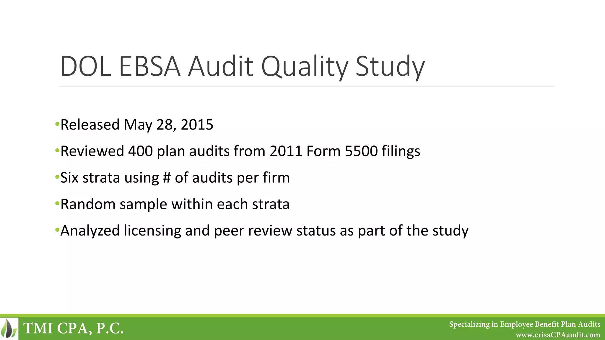 The document discusses the results of a Department of Labor audit quality study on employee benefit plan audits, revealing major deficiencies and compliance issues across a significant number of audited firms. Key findings include a high overall deficiency rate, especially among smaller firms, and specific areas lacking proper documentation or evidence in audit processes. Recommendations include regulatory amendments, closer inspections of firms with high deficiency rates, and improvements in peer review processes to enhance audit quality.